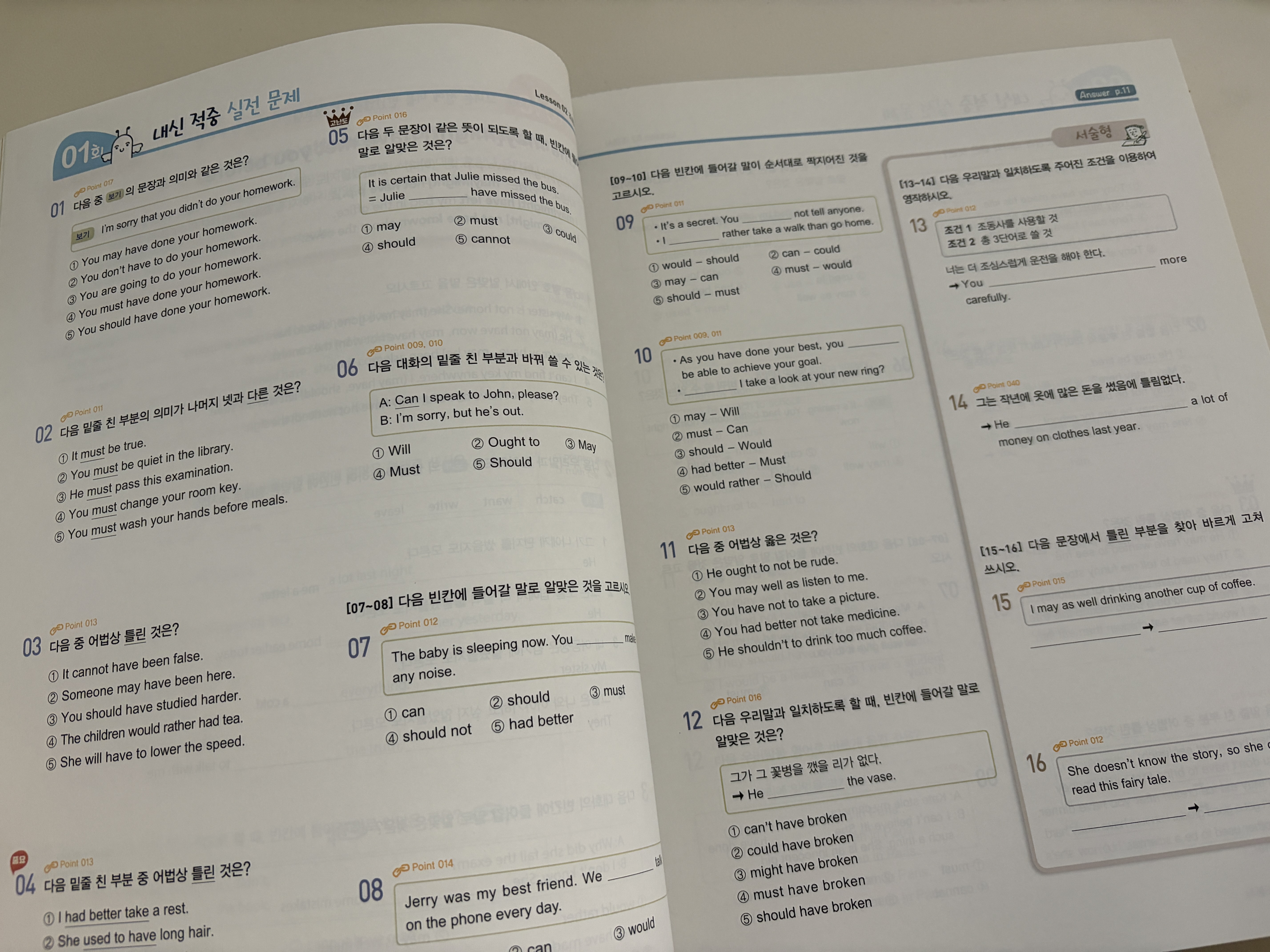 | 본문 | 각 레슨 마지막 페이지는 Grammar Review 핵심 정리여서 해당 영문법의 핵심 내용을 마무리하는데 도움이 많이 됩니다. 나중에 이 핵심정리 페이지만 모아서 복습하면 좋을 것 같더라구요. 교과서의 대표문장으로 학습하는 중학영문법 MANUAL 119는 출제 가능성 높은 문제와 꼼꼼한 테스트로 영문법 실력을 쌓는데 도움이 많이 되는 교재라 중학생 아이들에게 추천하고 싶은 영문법 교재입니다.