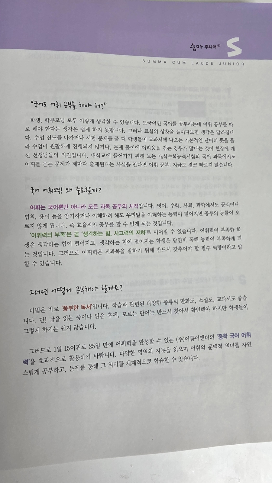 국어공부 어휘가 시작입니다. 숨마주니어 중학 국어 어휘력 개정증보판