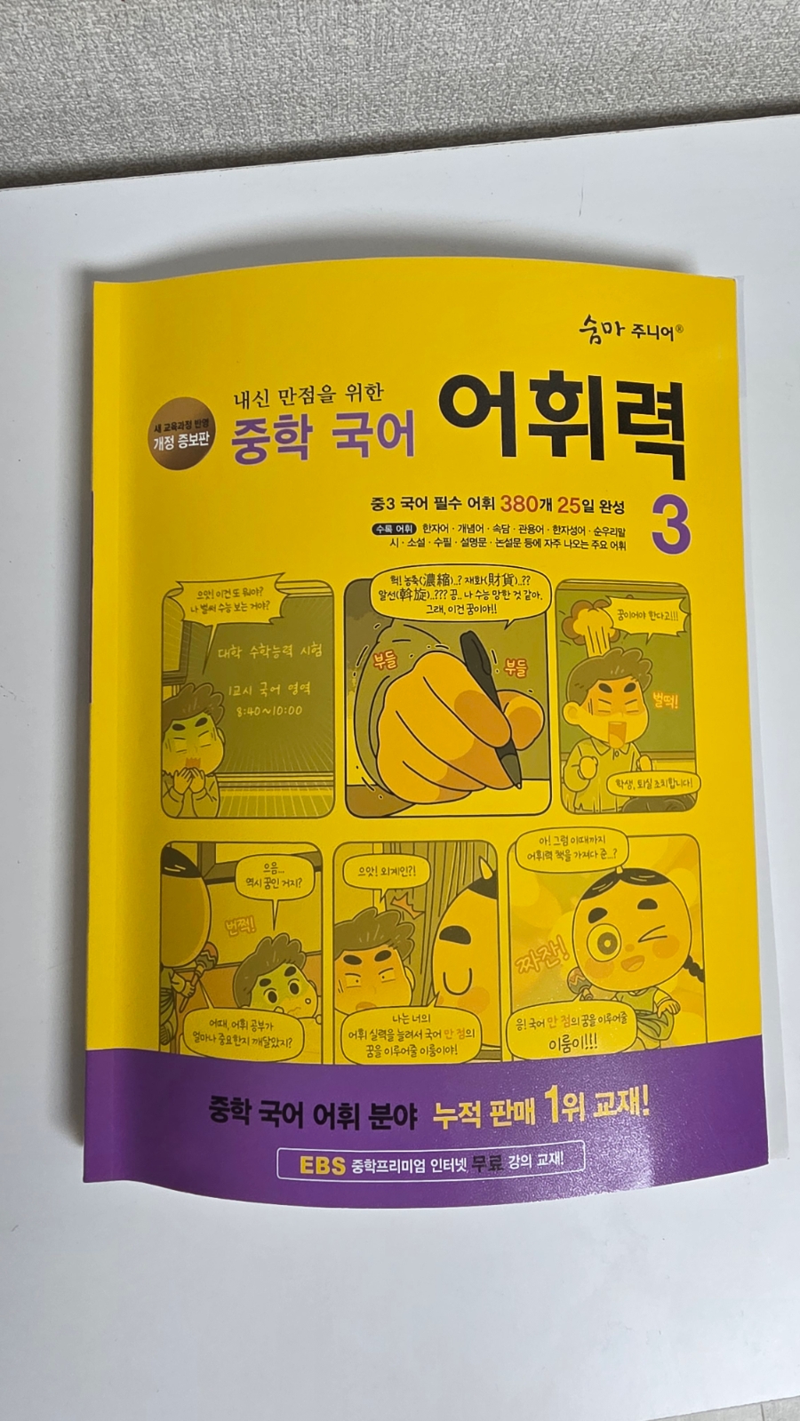 | 본문 | 우리딸은 초등학교때부터 쭈욱 숨마문제집으로 공부를 해왔는데 다음주 기말고사가 끝나면 중3공부도 해놔야할것같아서 국어어휘 시작은 역시 숨마주니어 중학 국어 어휘력3문제집을 선택했어요 숨마 주니어 내신 만점을 위한 어휘력 중학 국어3 새교육과정 반영 개정 증보판 수목 어위 한자어.개념어.속담.관용어.한자성어.순우리말 시.소설.수필.설명문.논설문 등에 자주 나오는 주요 어휘 중학 국어 어휘 분야 누적 판매 1위 교재! EBS 중학프리미엄 인터넷 무료 강의 교재!