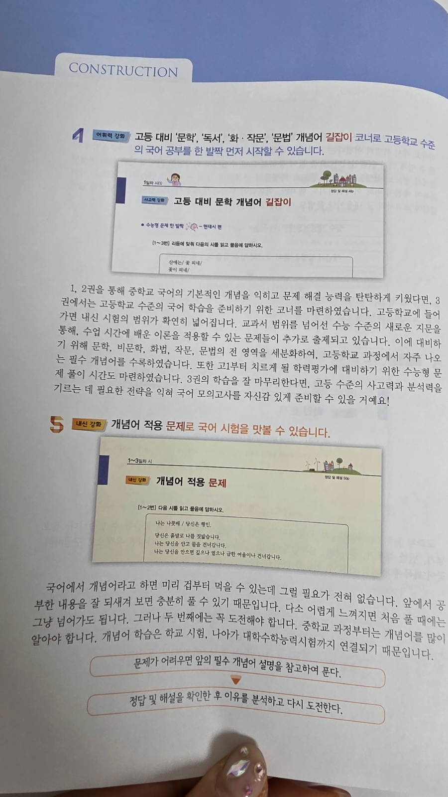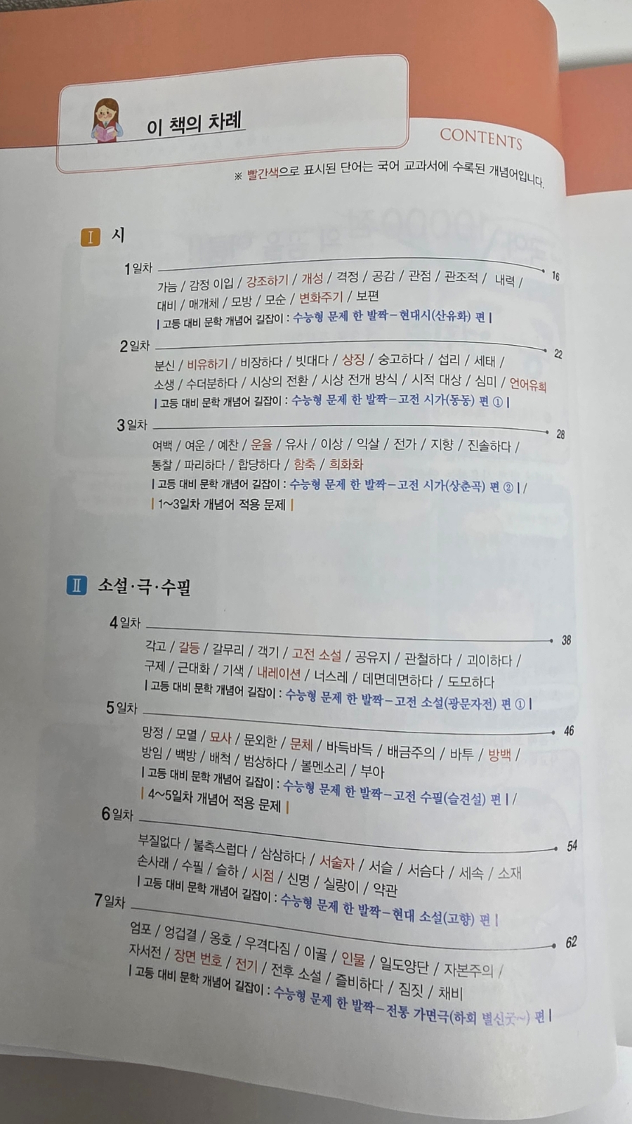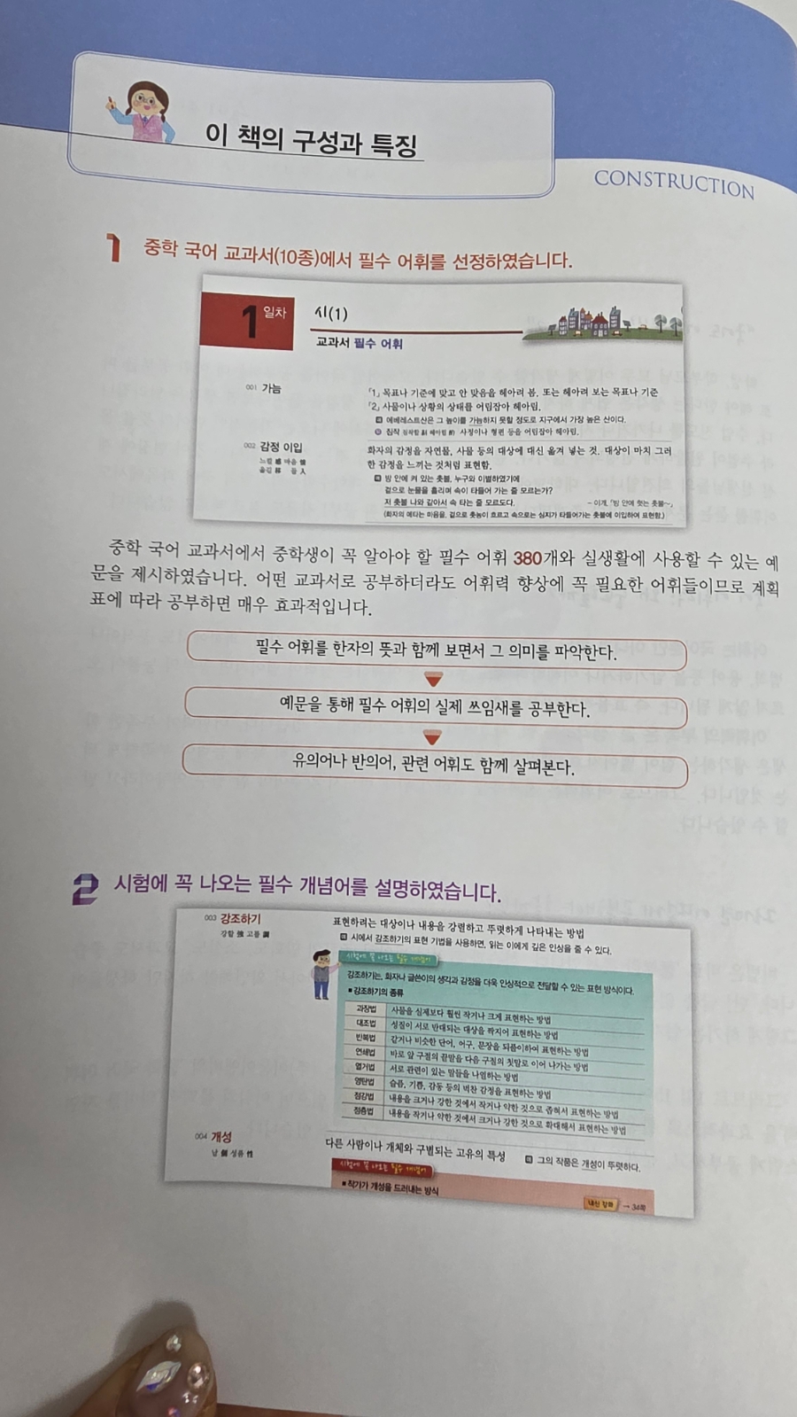 "국어도 어휘 공부를 해야 해?' 수업 진도를 나가거나 시험 문제를 풀 때 학생들이 교과서에 나오는 기본적인 단어의 뜻을 몰라 수업이 원활하게 진행되지 않거나, 문제 풀이에 어려움을 겪는 경우가 많다는 것이 요즘 중학생들의 현실이라고하는데요. 어휘는 국어뿐만 아니라 모든 과목 공부의 시작입니다. 영어. 수학. 사회. 과학에서도 공식이나 법칙. 용어 등을 암기하거나 이해하려 해도 이해하는 능력이 떨어지면 공부의 능률이 오 르지 않게 되는것처럼 '어휘력의 부족'은 곧 '생각하는 힘. 사고력의 저하'로 이어질 수 있습니다. 어휘력이 부죽한 학 생은 생각하는 힘이 떨어지고, 생각하는 힘이 떨어지는 학생은 당연히 독해 능력이 부족하게 되는 것입니다. 그러므로 어휘력은 전과목을 잘하기 위해 반드시 갖추어야 할 필수 역량이라 할수있겠죠 그러면 어떻게 공부해야 할까요? 비법은 바로 '풍부한 독서'입니다. 그러므로 1일 15어휘로 25일 만에 어휘력을 완성할 수 있는 이룸이앤비의 중학 국어 어휘력'을 효과적으로 활용하면서 다양한 영역의 지문을 읽어보고, 어휘의 문맥적 의미를 자연 스럽게 공부하고, 문제를 통해 그 의미를 체계적으로 학습할 수 있기에 겨울방학 국어교재로 추천하고싶어요 중학 국어 교과서(10종)에서 필수 어휘를 선정하였습니다.. 시험에 꼭 나오는 필수 개념어를 설명하였습니다 국어 공부에서 반드시 필요한 주요 개념어를 각 일차별로 1~4개씩 수록되어있어요 중학교 국어 과목이 예전에 비해 어려워지기도 했지만, 어휘력이 부족하기 때문이기도 합니다. 개념어를 많이 알아야 교과서의 글 내용이나 문법도 이해하기 쉽습니다 필수 개념어도 한자의 뜻풀이와 사전적 의미를 익힌다. 개념어 설명을 통해 교과서 필수 학습 요소를 익힌다 국어 내신 시험에 미리 대비한다. 필수 어휘 확인 문제를 통해 반복 학습을 할 수 있습니다 교과서 필수 어휘에서 공부한 표제어를 확인 문제를 통해 반복하여 학습할 수 있습니다. 괄호 넣기. 빈칸 채우기, 줄 긋기, 십자말풀이, 말 상자에서 단어 찾기 등 다양한 유형으로 구성하여 국어 과목에 흥미를 가질 수 있도록 만들었어요 문제를 처음 풀 때에는 앞의 내용을 확인하지 않는다 반드시 채점을 하여 자신의 실력을 파악한다. 틀린 문제는 표제어를 다시 읽어본 후 나중에 반복해서 풀어본다 어휘력 강화 고등 대비 '문학' '동서' '학. 작문' '문법' 개념어 길잡이 코너로 고등학교 수준의 국어 공부를 한 발짝 먼저 시작할 수 있습니다 1, 2권을 통해 중학교 국어의 기본적인 개념을 익히고 문제 해결 능력을 탄탄하게 키있다면, 3권에서는 고등학교 수준의 국어 학습을 준비하기 위한 코너를 마련하였습니다. 고등학교에 들어 가면 내신 시험의 범위가 확연히 넓어지고, 교과서 범위를 넘어선 수능 수준의 새로운 지문을 통해, 수업 시간에 배운 이론을 적용할 수 있는 문제들이 추가로 출제되고 있다고해요 이에 대비하 기 위해 문학, 비문학, 화법, 작문, 문법의 전 영역을 세분화하여, 고등학교 과정에서 자주 나오 는 필수 개념어를 수록하였습니다. 또한 고1부터 치르게 될 학력평가에 대비하기 위한 수능형 문제풀이도 수록되어있어요 3권의 학습을 잘 마무리한다면, 고등 수준의 사고력과 분석력을 기르는 데 필요한 전략을 익혀 국어 모의고사를 자신감 있게 준비할 수 있을 거예요! 중학교 과정부터는 개념어를 많이 알아야 합니다. 개념어 학습은 학교 시험. 나아가 대학수학능력시험까지 연결되기 때문입니다. ●문제가 어려우면 앞의 필수 개념어 설명을 참고하여 푼다. ●정답 및 해설을 확인한 후 이유를 분석하고 다시 도전한다. '어휘 줍기'로 사고력을 높일 수 있습니다 한 컷 만화를 통해 잠깐 쉬어가도록 하세요 만화를 재미있게 감상하고 그림에 나오는 단어 중 모르는 것은 사전을 통해 익히기 바랍니다. 어휘 공부! 어렵게 생각하지 마세요. 생활 주변의 모든 것들이 공부할 거리입니다 '5분 테스트 Book'으로 자투리 시간을 활용하세요 하루 5분으로 국어 과목과 친해지세요. 본책에서 이미 공부한 어휘들이기 때문에 무난하게 풀 수 있습니다. 단원별로 섞어서 출제되기 때문에 활용하기 좋아요 국어 만점의 꿈을 이뤄볼까요? 중학국어 어휘력 3으로 공부하면, 1️⃣ 어휘력과 독해력이 동시에 쑥쑥 중학교 과정을 마무리하면서 꼭 알아야 할 어휘와 고등학교에서도 자주 출제되는 어휘를 체계적으로 학습해요! 예시를 통해 어휘를 문맥에 맞게 사용하는 연습을 하다 보면 독해력도 자연스럽게 향상돼요! 2️⃣ 지식의 폭은 활짝| 1권과 2권을 공부하면서 이~만큼 쌓인 배경지식을 활용하여 국어 전 영역의 심화 문제 풀기에 도전해 보아요 높아진 난도만큼 지식의 폭이 넓어져요, 3️⃣사고력은 쭉쭉 보기를 참고하여 문학 작품 분석에 필요한 개념어를 떠올리고 길어진 비문학 지문에 숨어 있는 필수 어휘들의 의미를 추론해 보아요! 지문 해석의 기초를 다지는 사고력이 자라나요 빨간색으로 표시된 단어는 국어 교과서에 수록된 개념어로 표시하여 1일차부터 매일매일 차례대로 배워야 할 내용을 정리했어요. 차례를 먼저 쭉 훝어