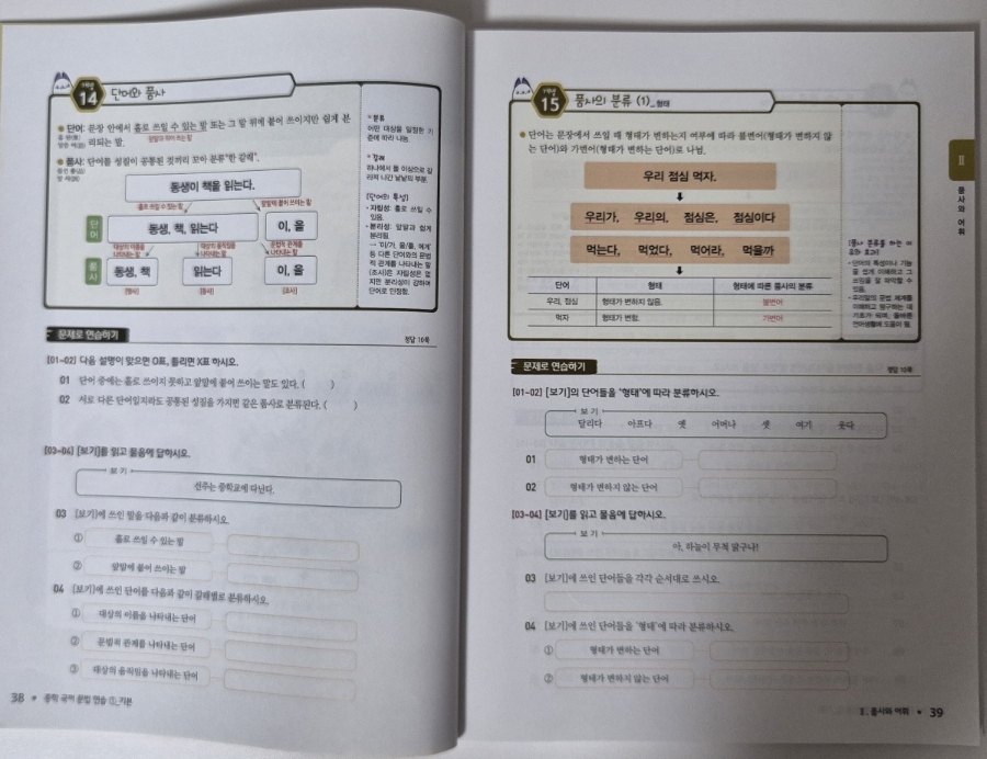 중학 국어 문법 교재 분야 누적 판매 1위! EBS 중학프리미엄 인터넷 무료 강의 교재! ![]() 우리집 아이는 국어 문법 용어가 나오기 시작하면 표정부터 굳어져요. 저 역시 다시 펼쳐 보니 쉽지 않았어요. 우리가 늘 쓰는 말인데도 막상 설명해 주려니 생각처럼 정리가 되지 않더라고요. 중학교에 올라가면 형태소, 품사, 문장 성분 같은 용어들이 한꺼번에 등장하는데요. 아이 입장에서는 갑자기 다른 언어를 배우는 느낌이 들 수도 있겠다는 생각이 들었어요. 그래서 문법을 어렵게 느끼는 게 당연하겠구나 싶었어요. 그래서 선택한 교재가 기본이에요. ![]() 은 중학교 전 과정에서 꼭 알아야 할 문법 개념을 약 57개로 정리해 두었어요. ![]() ![]() 30일 완성 구조라 하루 학습 분량이 분명해서 계획 세우기가 수월했어요. ![]() 학습 계획표를 보니 10분 리뷰 테스트와 실력 완성하기는 순서를 조정해도 된다고 안내되어 있어 아이 상황에 맞게 유연하게 활용할 수 있겠더라고요. ![]() 처음 문법을 시작하는 아이나 기초가 부족한 아이에게 부담이 크지 않다는 점이 가장 마음에 들었어요. 개념 설명이 길게 늘어지지 않으면서도 핵심을 빠뜨리지 않고 짚어 주어서 읽는 데 부담이 적었어요. ![]() ![]() 을 보며 다시 느낀 점은 문법이 어려운 이유가 국어 실력 부족 때문이 아니라 설명 방식에 익숙하지 않아서라는 거예요. ![]() ![]() ![]() 같은 단어라도 발음 관점에서 보면 달라지고, 형태를 기준으로 나누면 또 달라지고, 문장 안에서의 역할에 따라 이름이 바뀌잖아요. 아이가 헷갈려하던 지점이 바로 그 부분이었어요. 그 연결을 차근차근 짚어 주는 구성이 마음에 들었어요. ![]() ![]() 은 개념을 익힌 뒤 바로 확인 문제로 이해를 점검하고, 이어지는 연습 문제에서 어떤 개념이 적용되었는지 생각해 보게 만드는 흐름이라 암기보다는 이해 중심으로 학습할 수 있어요. 설명이 어렵지 않아 아이도 스스로 읽어 보려는 모습이 보였어요. ![]() 로 단원마다 정리된 개념 MAP도 도움이 되더라구요. 개념이 따로 흩어져 있는 것이 아니라 하나의 체계로 연결되어 보이니 정리가 훨씬 잘 되는 느낌이었어요. ![]() ![]() ![]() 마지막 10분 리뷰 테스트 16회분은 배운 내용을 다시 다지는 역할을 해 주어서 복습용으로 활용하기 좋겠더라구요. ![]() ![]() 게다가 의 해설도 만족스러웠어요. ![]() 정답만 제시하는 것이 아니라 풀이 근거를 함께 설명해 주어 틀린 이유를 이해할 수 있게 도와주어요. 그래서 학원 교재로도 많이 사용되는 이유를 알겠더라고요. 난이도가 과하지 않으면서도 기본 개념은 빠짐없이 다루고 있고, 혼자 공부하기에도 충분히 가능한 구조예요. ![]() 중학교 문법은 고등 국어와 수능으로 이어지는 누적형 영역이에요. 지금 시기에 기본을 단단히 잡아 두는 것이 결국 큰 차이를 만든다고 느꼈어요. ![]() ![]() ![]() 문법이 막막하게 느껴진다면 처음부터 다시하고 그 바탕으로 이해 중심으로 정리해보는 것도 큰 도움되겠어요. 국어 문법의 첫 단추를 다시 끼우고 싶은 학생들에게 을 강력 추천드려요. ![]() ▶ 학습에 필요한 다양한 자료는 아래 홈페이지에서 확인할 수 있어요. 무료 학습자료실 : https://www.erumenb.com/bookdata 선생님 자료실 : https://www.erumenb.com/teacher 이룸이앤비 공식 홈페이지. 초중고 참고서 출판전문 기업으로 숨마쿰라우데, 숨마주니어, 숨마어린이, 독해왕, 어휘왕, 기초 기본서, 개념서, 유형서, 실전 워크북까지 체계적인 학습교재을 제작합니다. www.erumenb.com #이룸이앤비 #중학국어문제집 #중학교국어 #중학교국어문제집 #국어문법문제집 #예비중학생국어문법 #중학국어문법 #중학국어문법문제집 #중학국어 #숨마주니어 #숨마쿰라우데 |