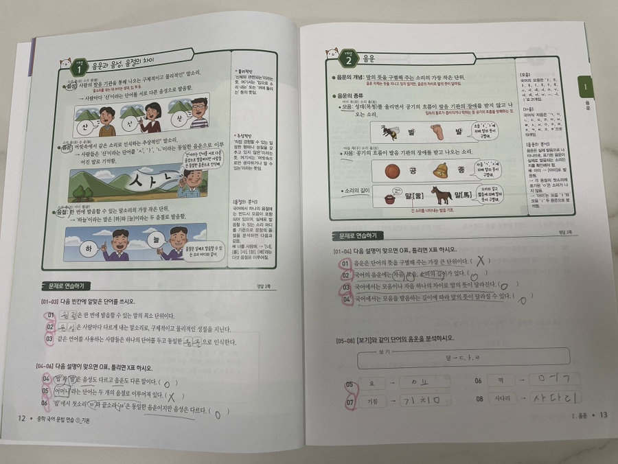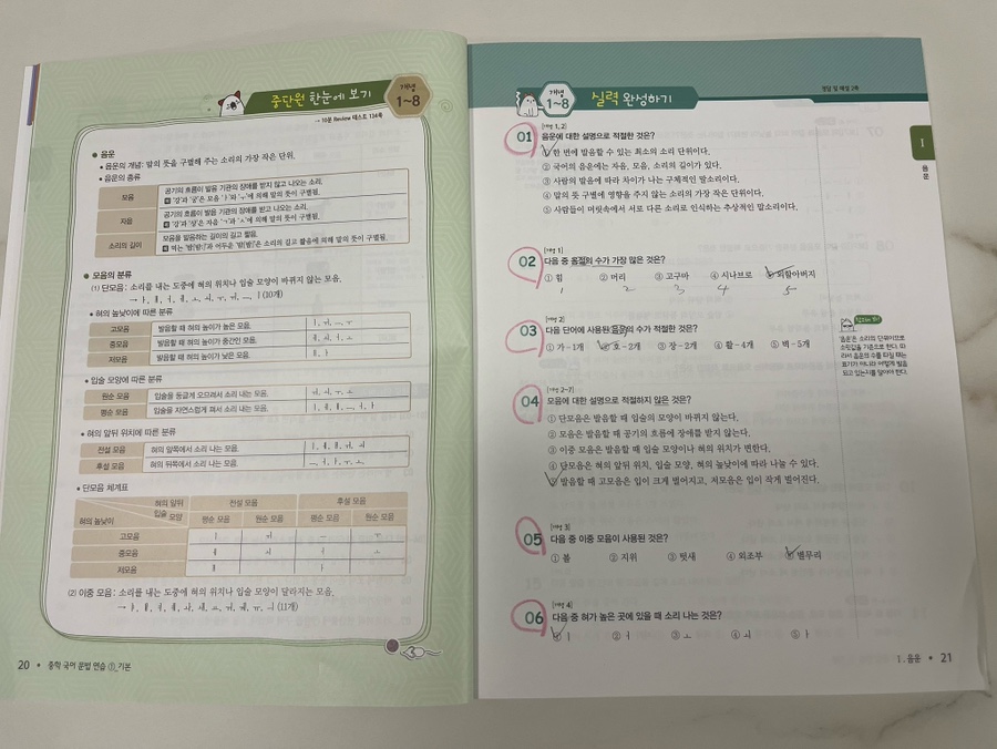 | 본문 | 시각자료와 도표 등을 활용하여 중하국어문법 개념을 쉽게 이해할 수 있도록 하고 암기식 공부보다는 이해를 먼저 할 수 있게 개념 설명을 하고 있어요. 그렇기에 아이 혼자 교재를 보면서 자기주도 학습을 할 수 있고 다양한 예시를 보면서 쉽게 이해하며 문법을 충분히 공부할 수 있는 교재로 추천해요.