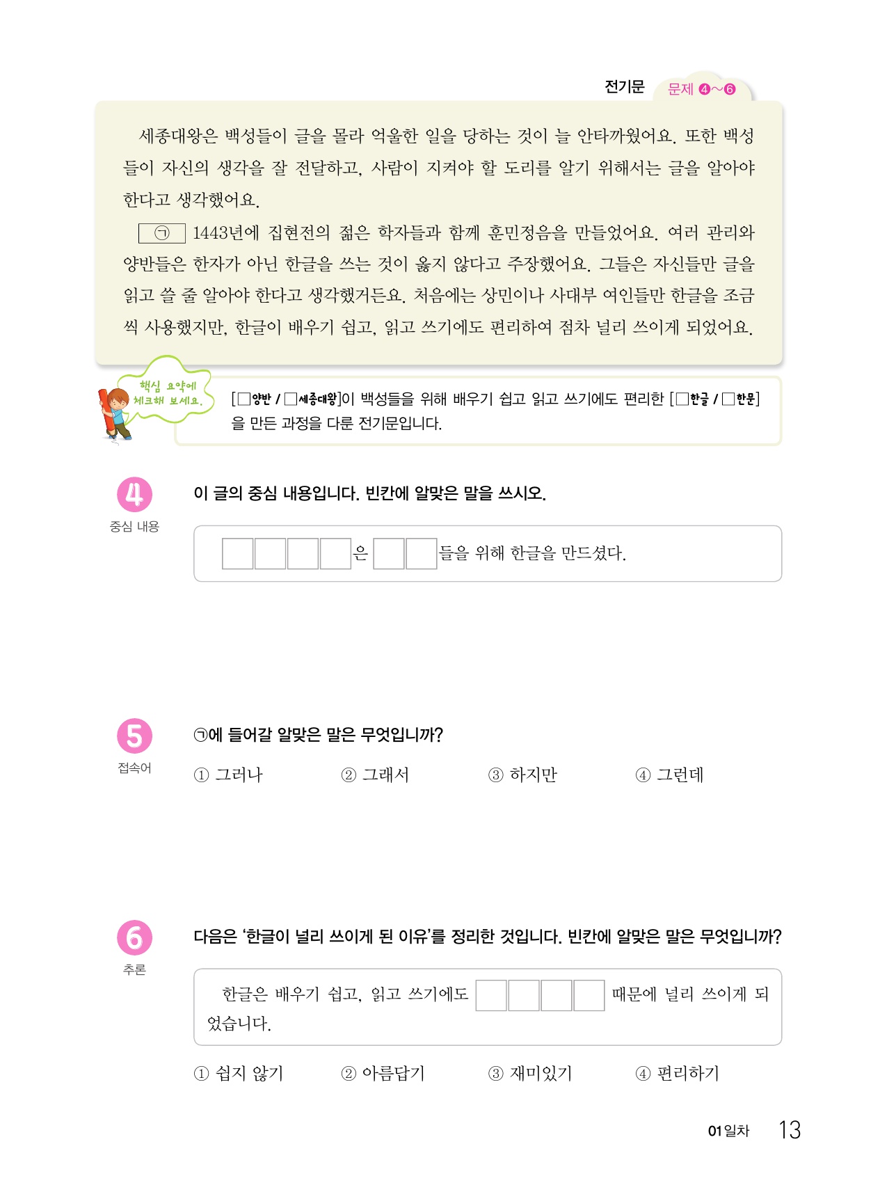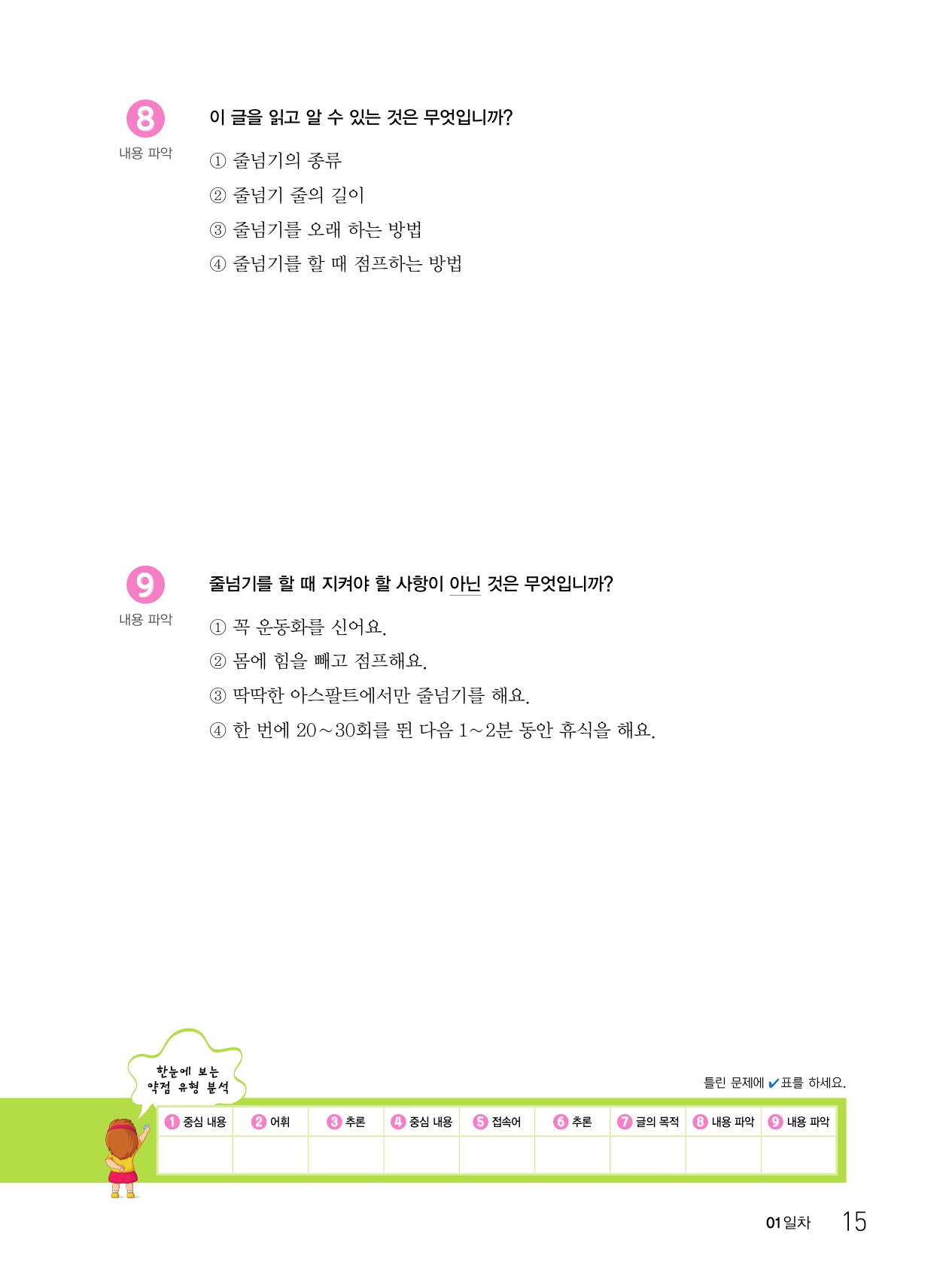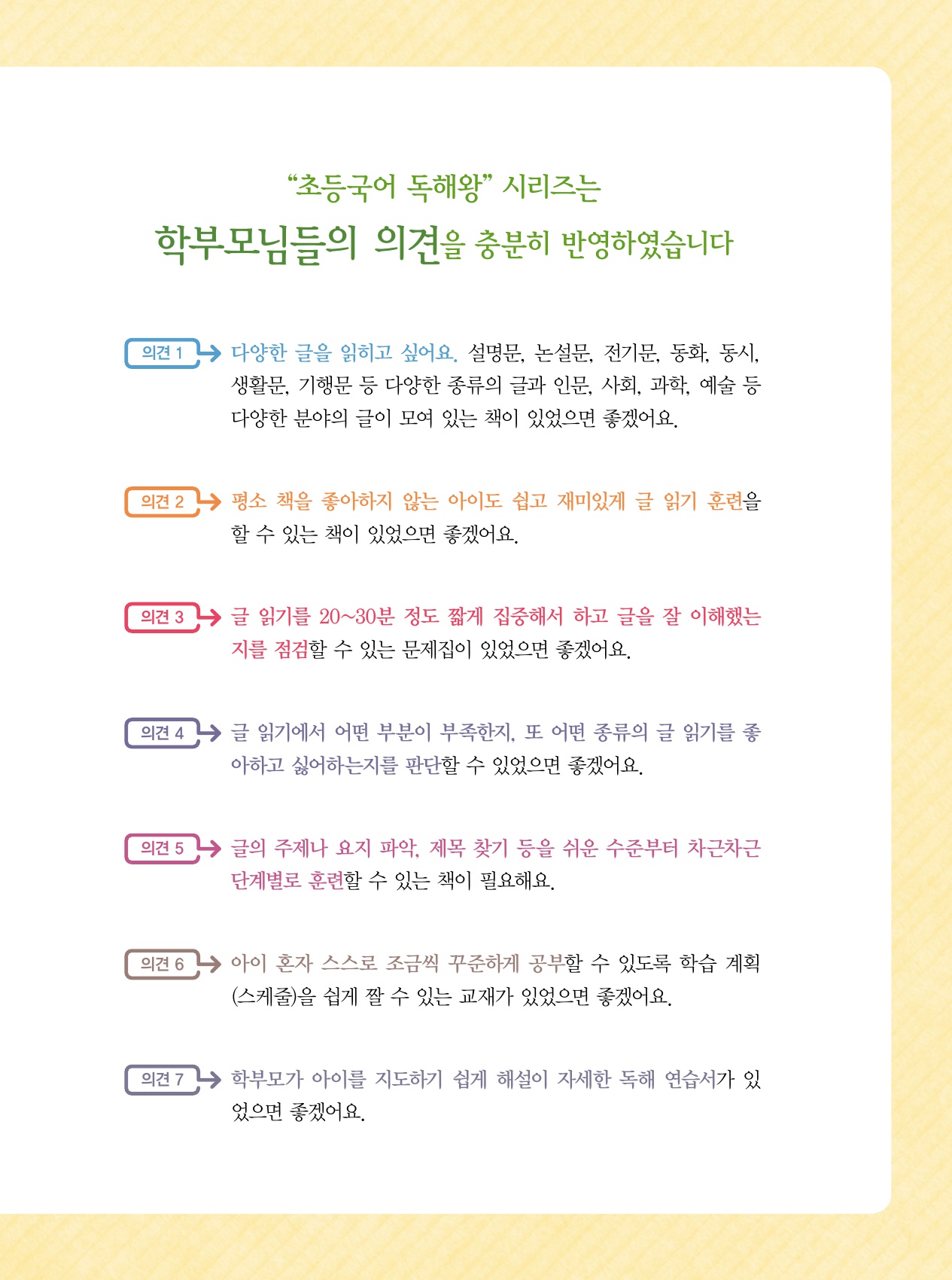 글의 중심 내용, 핵심어, 주제, 목적 등을 정확하게 이해하는지를 묻는 사실적 이해 문항과 이를 바탕으로 다른 상황에 적용, 추론할 수 있는지를 묻는 다양한 문제로 구성하여 효율적인 독해 훈련이 가능하도록 하였습니다.?