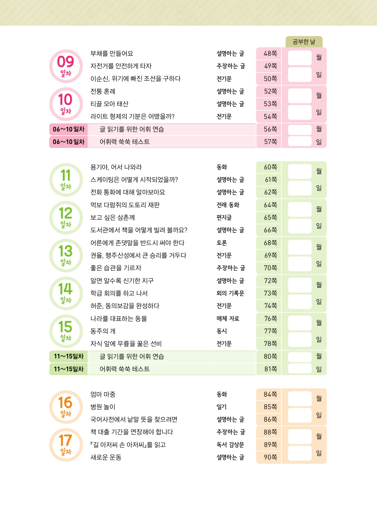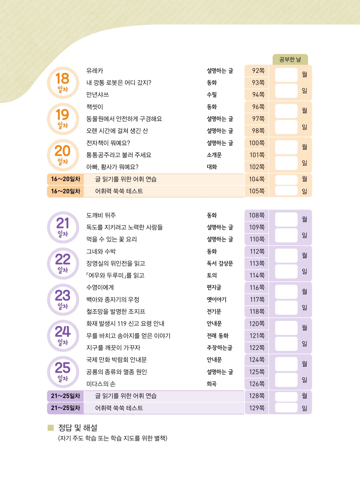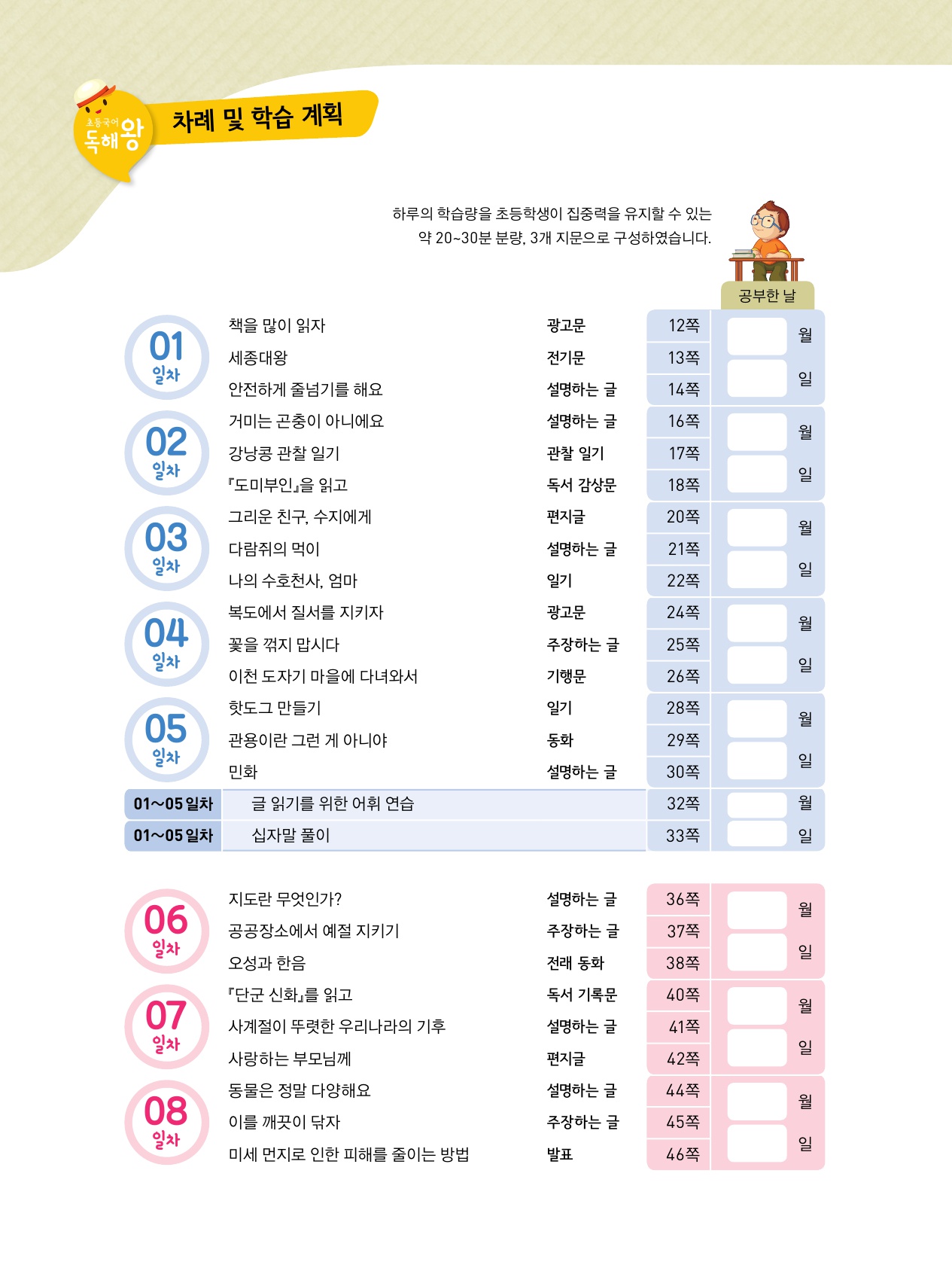 하루의 학습량을 초등학생이 집중력을 유지할 수 있는 20~30분 분량, 2~3개 지문으로 구성하였습니다.?