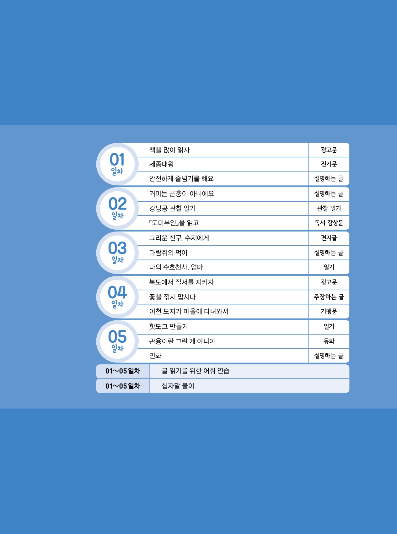 재미와 흥미를 유발할 수 있는 문학(동시, 동화, 기행문, 전기문 등)과 비문학(설명문, 논설문, 안내문, 소개문, 실용문 등) 등 다양한 종류의 글로 구성하였습니다.?