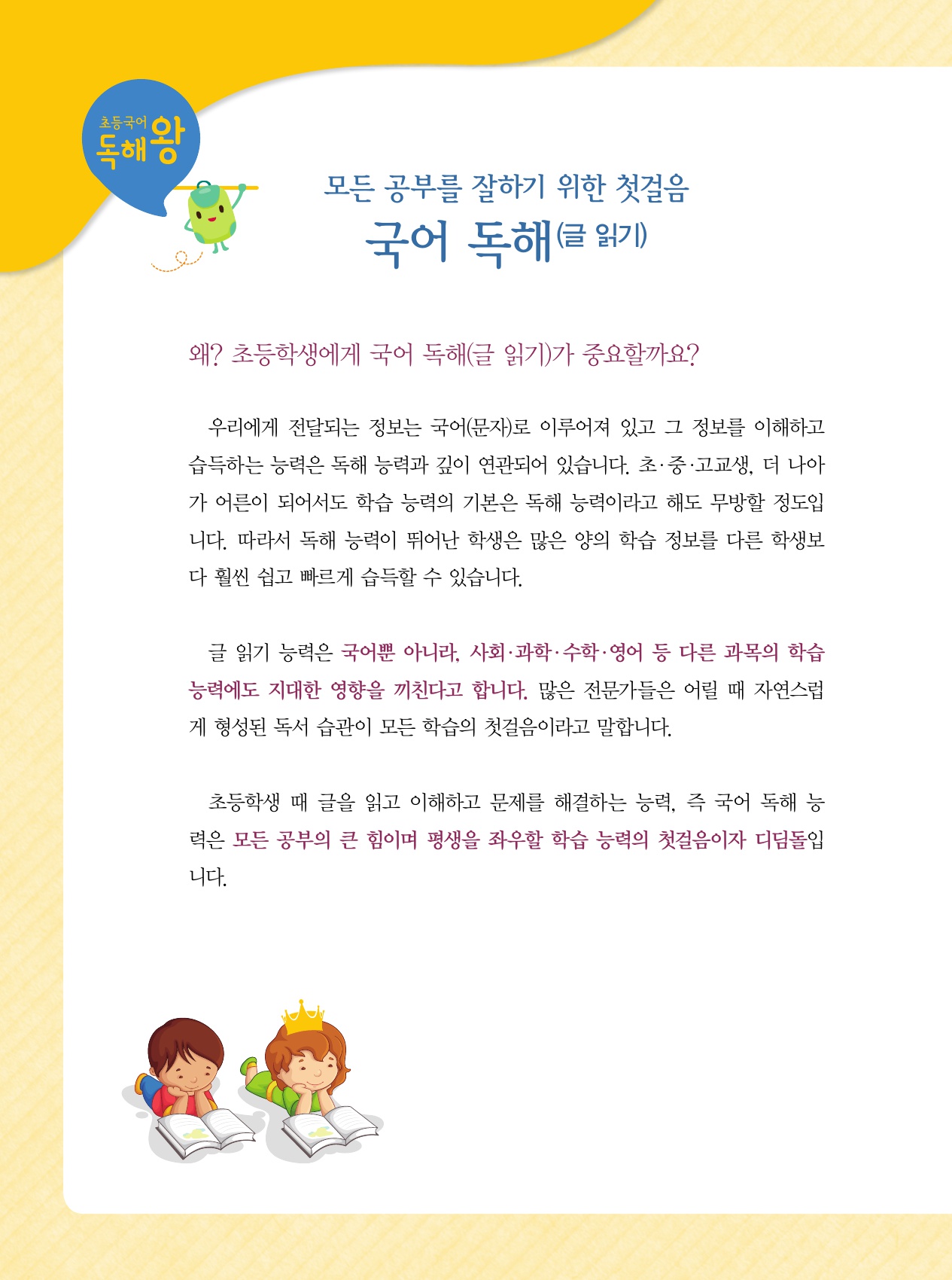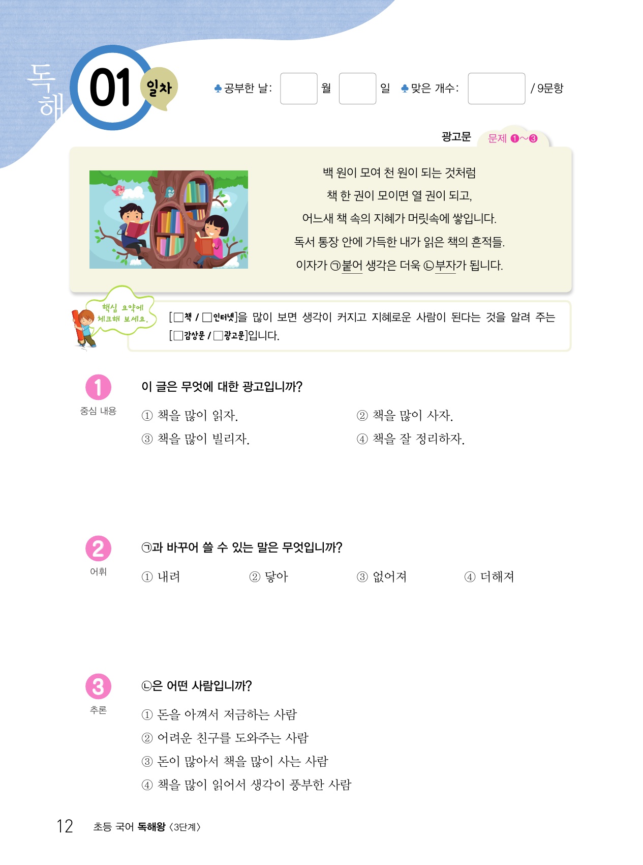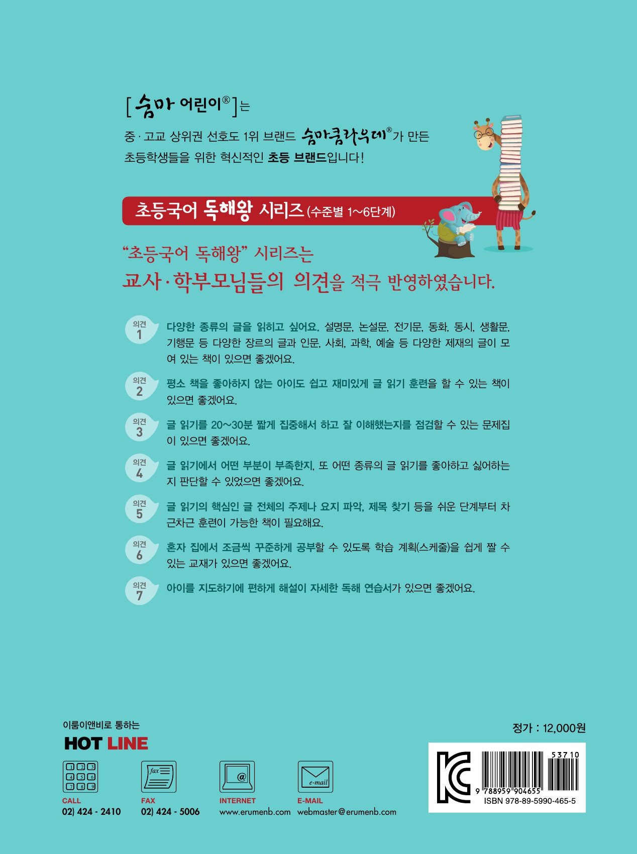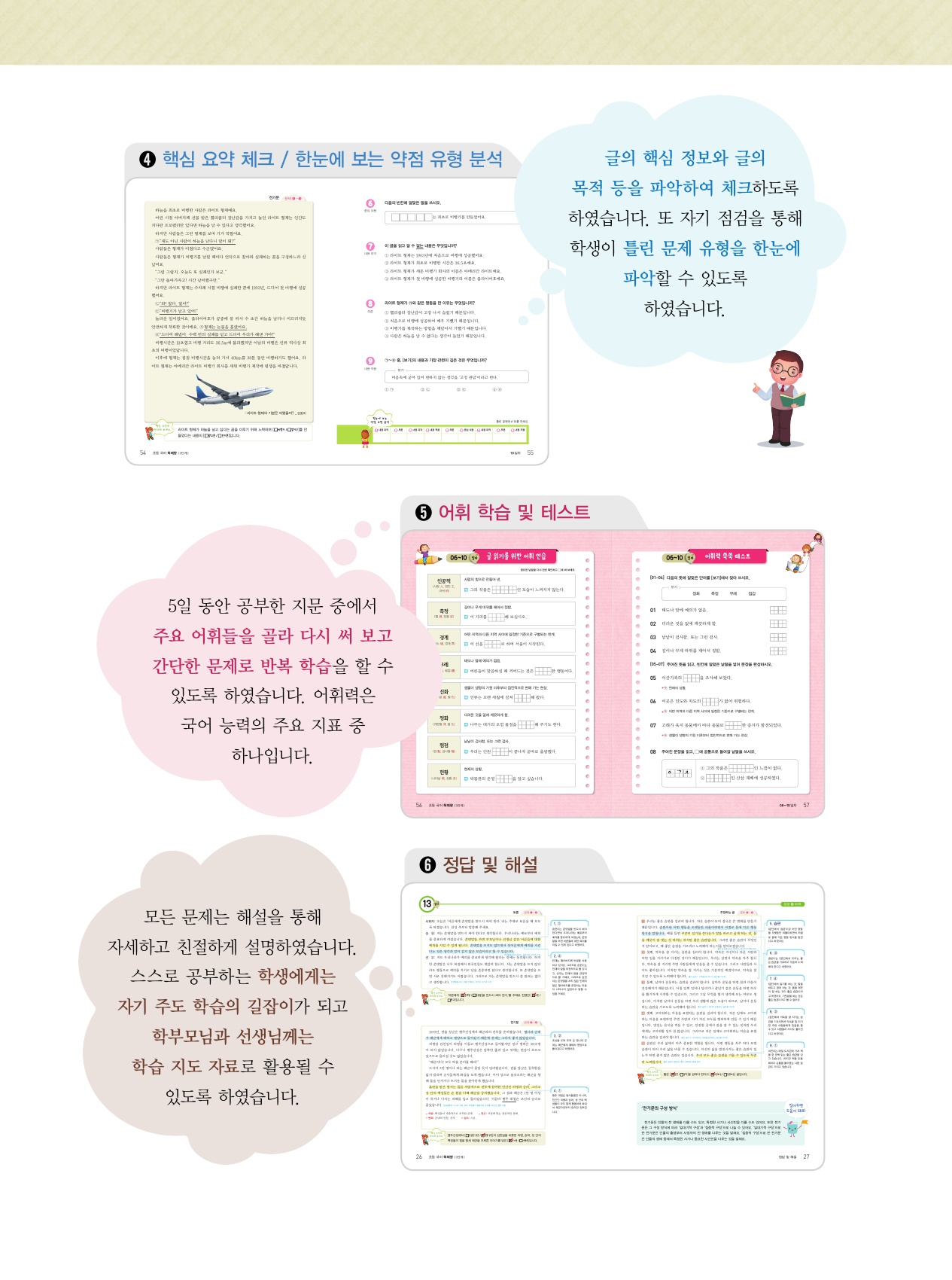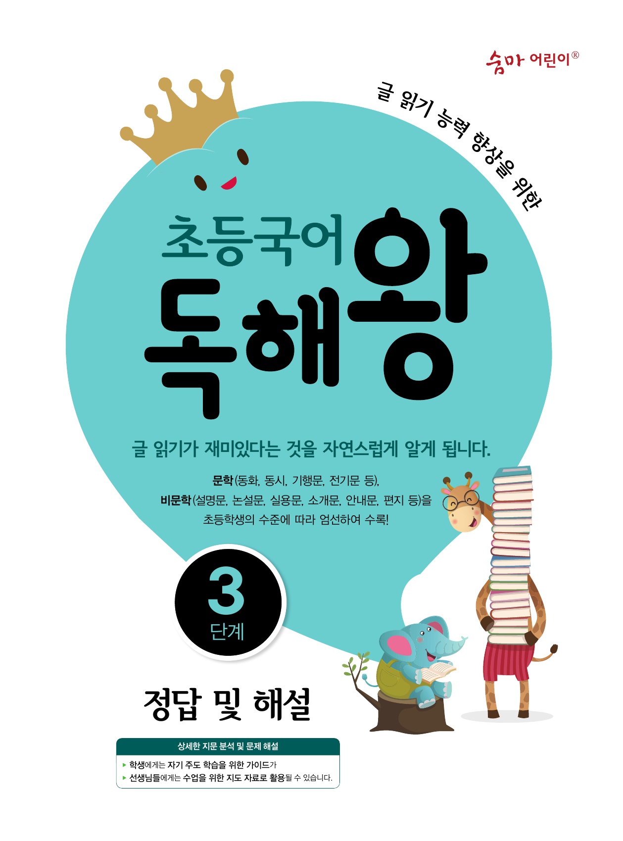 | 초등국어 독해왕은 글읽기가 재밌다는 것을 자연스럽게 알게 해주는 독해 문제집입니다. 문학- 동화, 동시, 기행문, 전기문 비문학 - 설명문, 논설문, 소개문, 안내문, 편지 초등학생 수준에 따라 엄선하여 수록하였고 재미와 흥미를 유발할 수 있는 문학, 비문학 지문을 다양하게 학습할 수 있어 우리아이들이 즐겁게 독해력을 기를 수 있습니다. | ★★★★★ | 2024-05-01 |