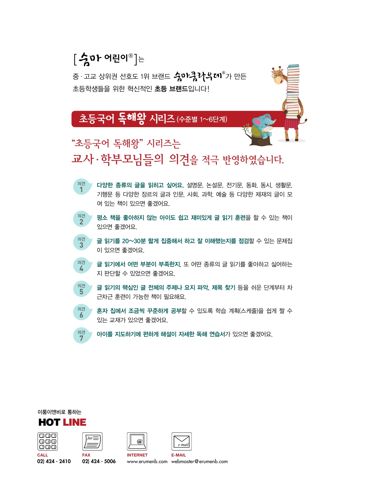 | 처음 접한 교재였지만, 이제는 매일의 루틴이 되어버린 초등국어문제집 독해왕! 아이 스스로 읽고, 생각하고, 어휘를 익히는 과정이자연스럽게 이어지니 진짜 ‘읽는 힘’이 자라는 게 보여요. 아이에게 글 읽는 즐거움과 생각하는 힘을 키워주고 싶다면숨마어린이 <초등 국어 독해왕>을 강력 추천드려요. | |||