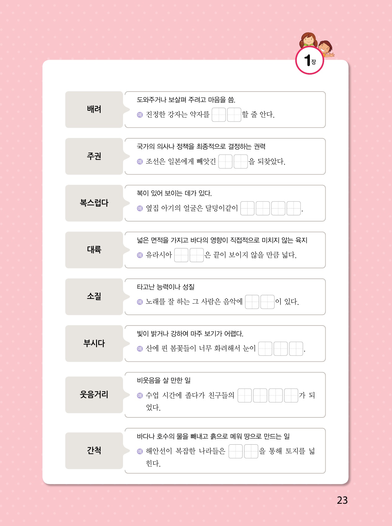 앞에서 공부한 어휘들을 다시 한번 확인해 보면서 확실한 어휘 학습이 되었는지 점검해 보세요.