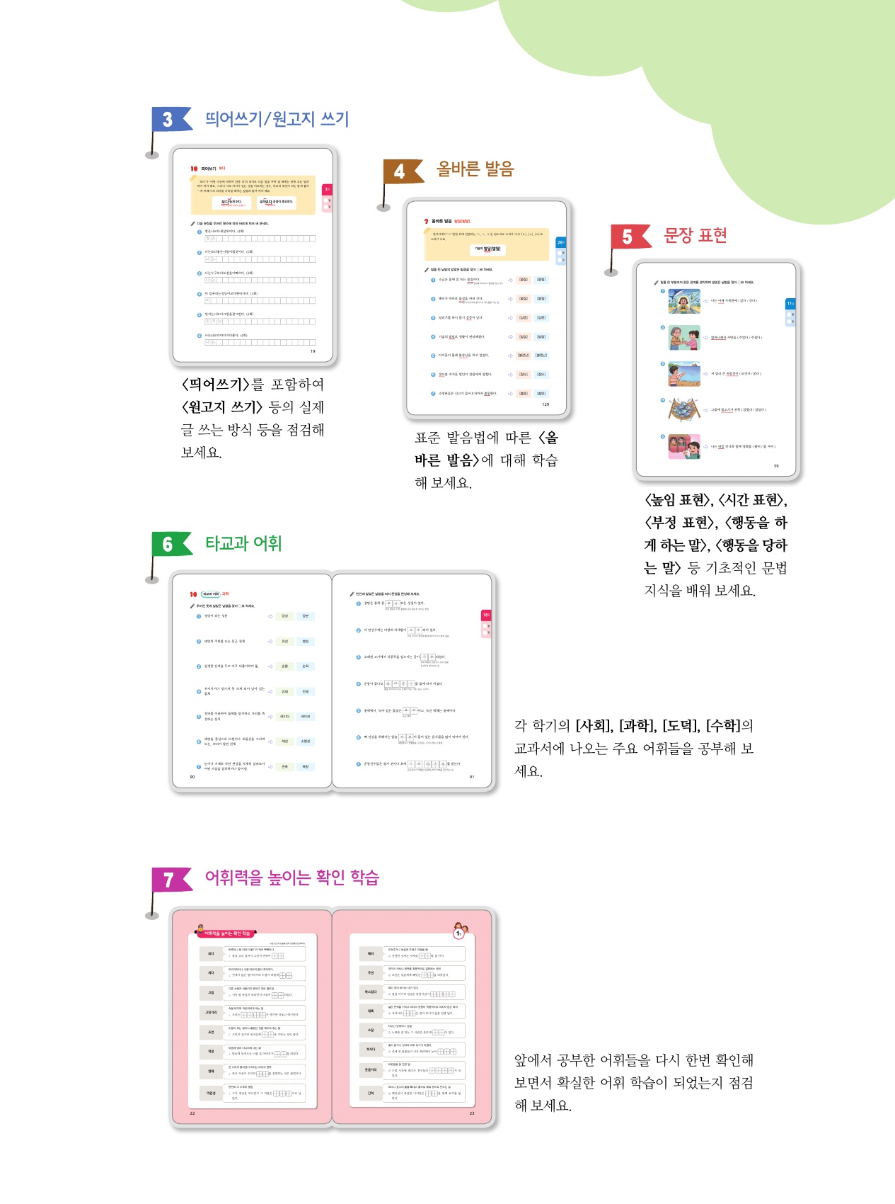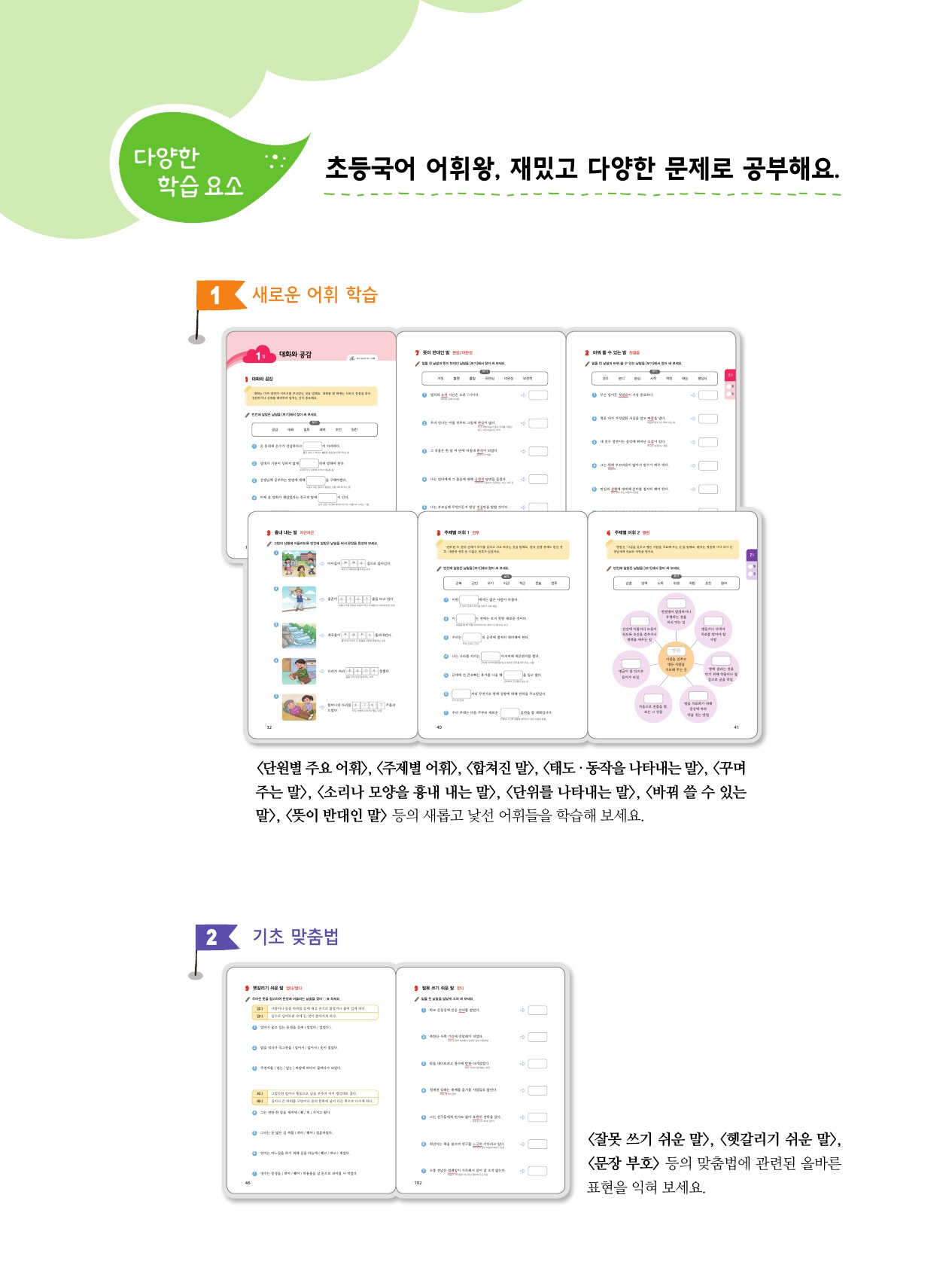 <단원별 주요 어휘>, <주제별 어휘>, <합쳐진 말>, <태도·동작을 나타내는 말>, <꾸며 주는 말>, <소리나 모양을 흉내 내는 말>, <단위를 나타내는 말>, <바꿔 쓸 수 있는 말>, <뜻이 반대인 말> 등의 새롭고 낯선 어휘들을 학습해 보세요.