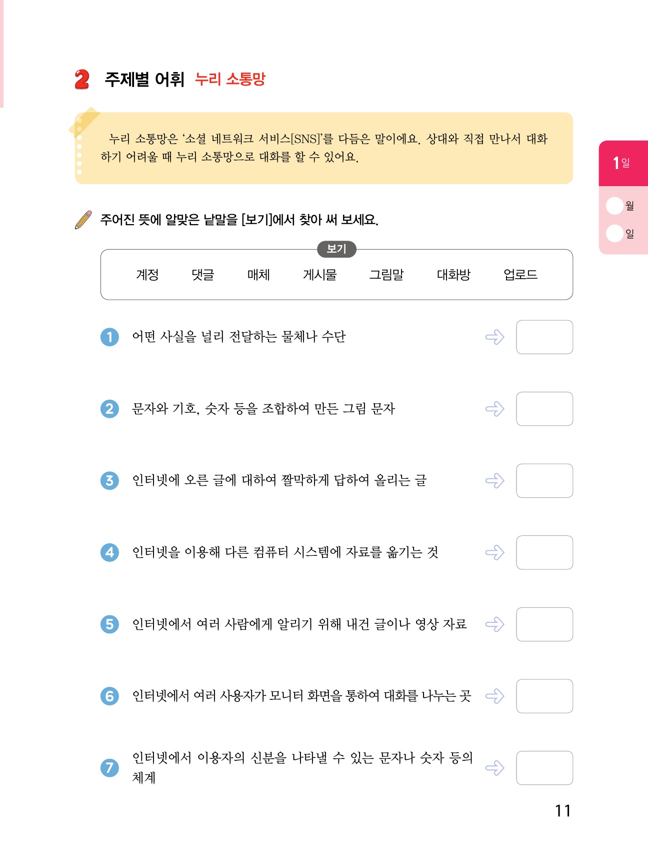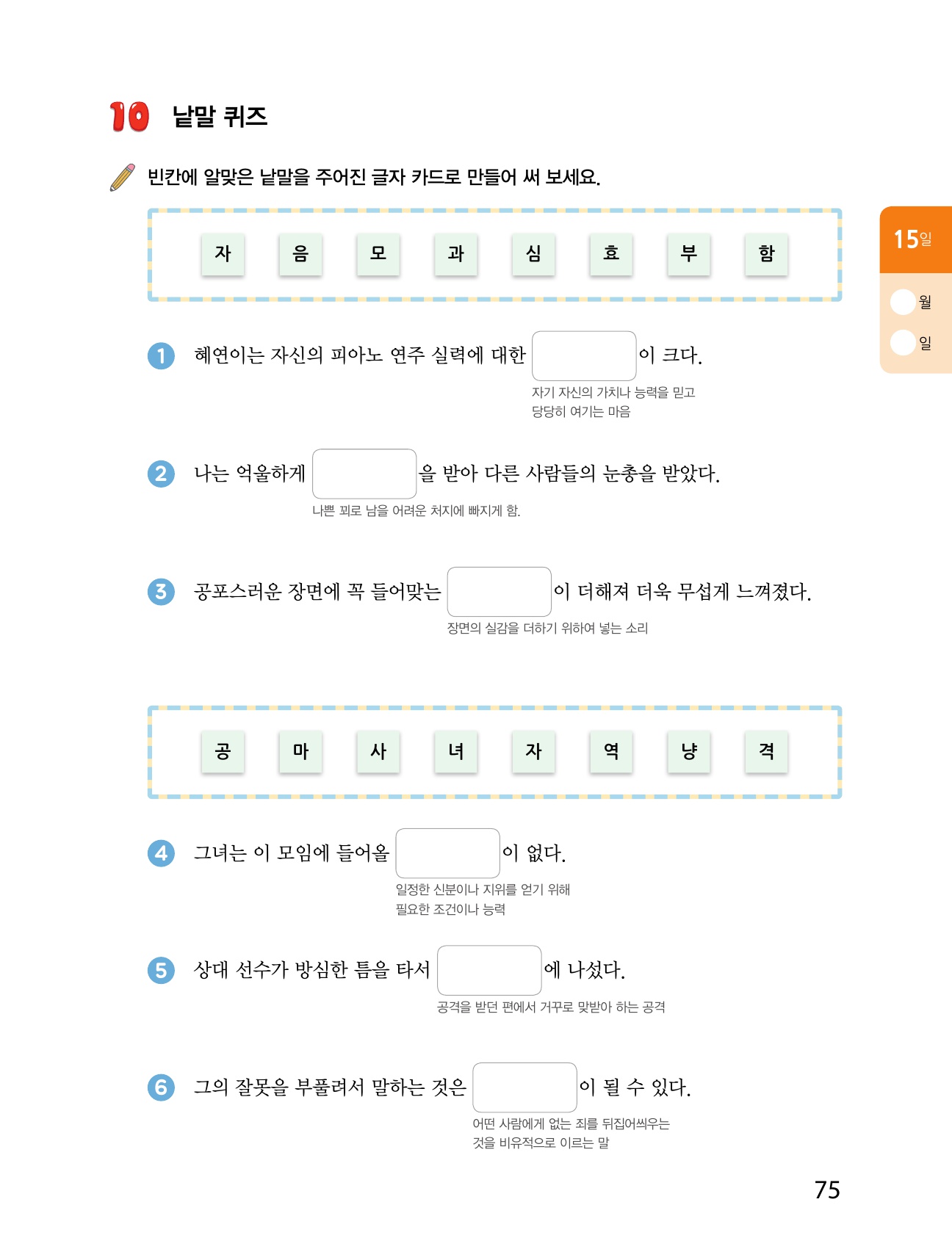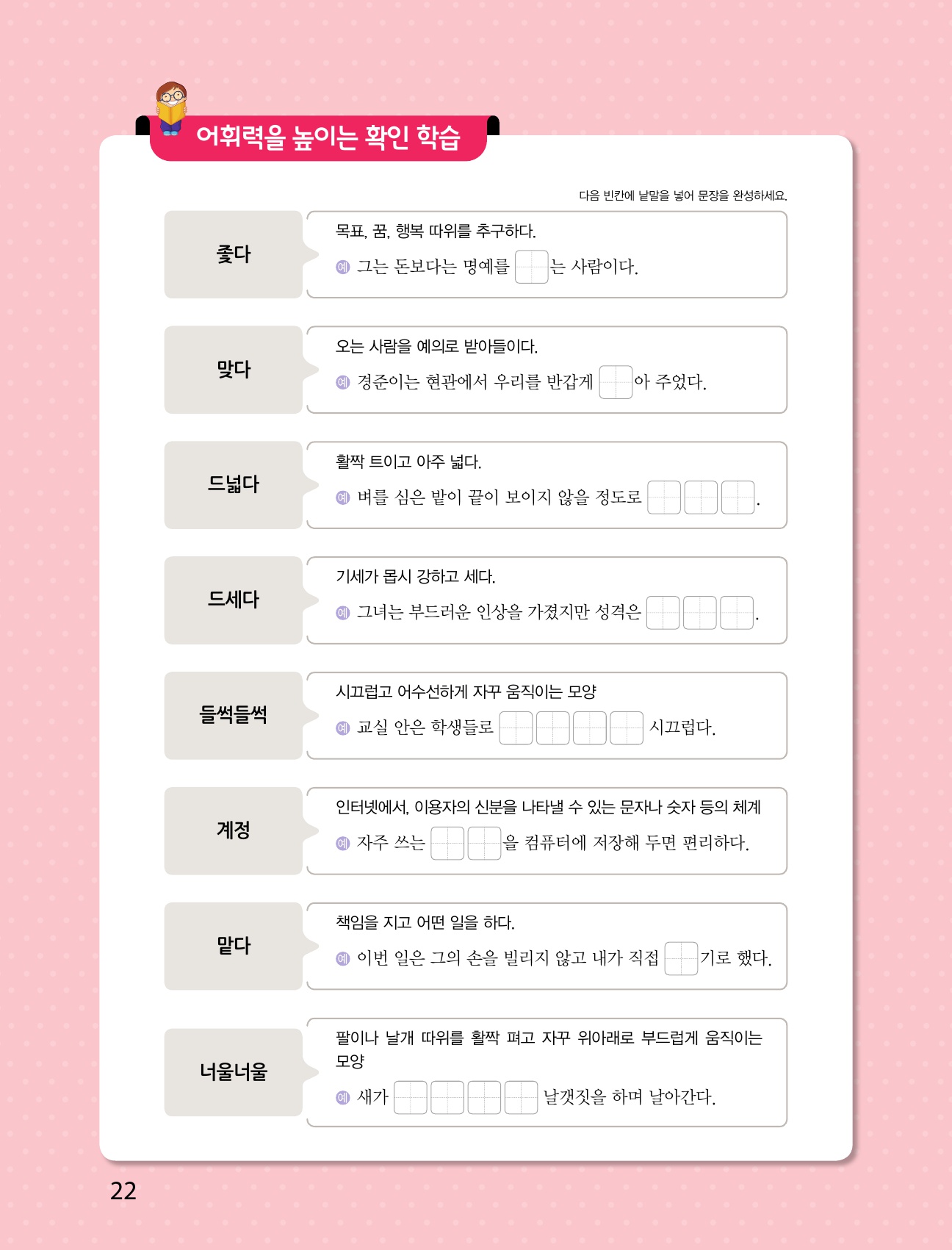 앞에서 공부한 어휘들을 다시 한번 확인해 보면서 확실한 어휘 학습이 되었는지 점검해 보세요.