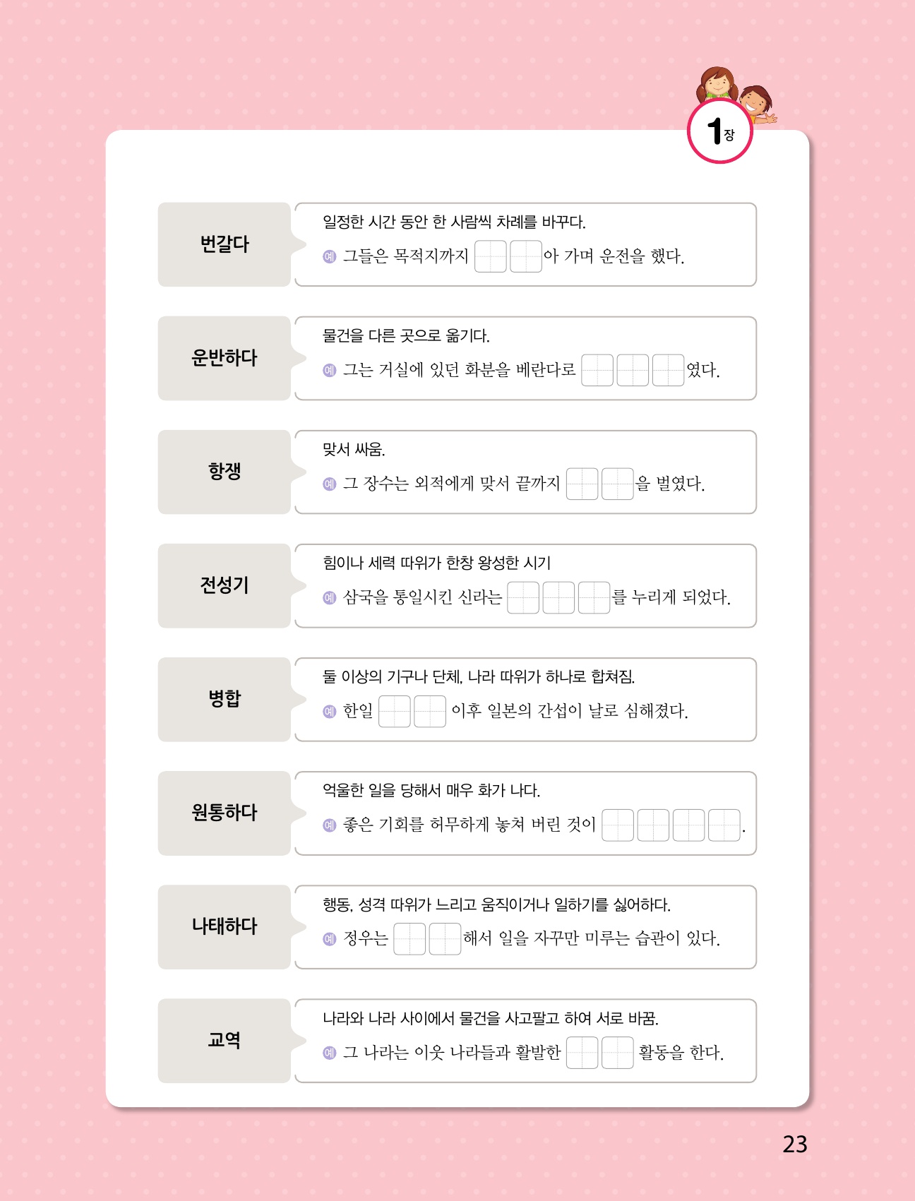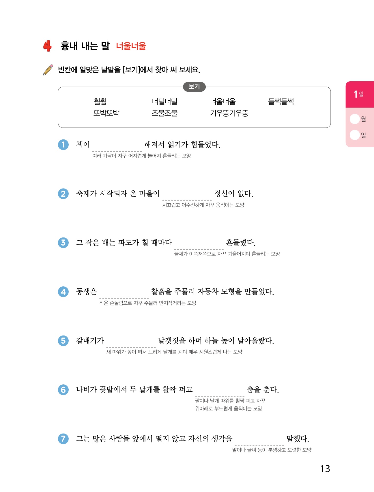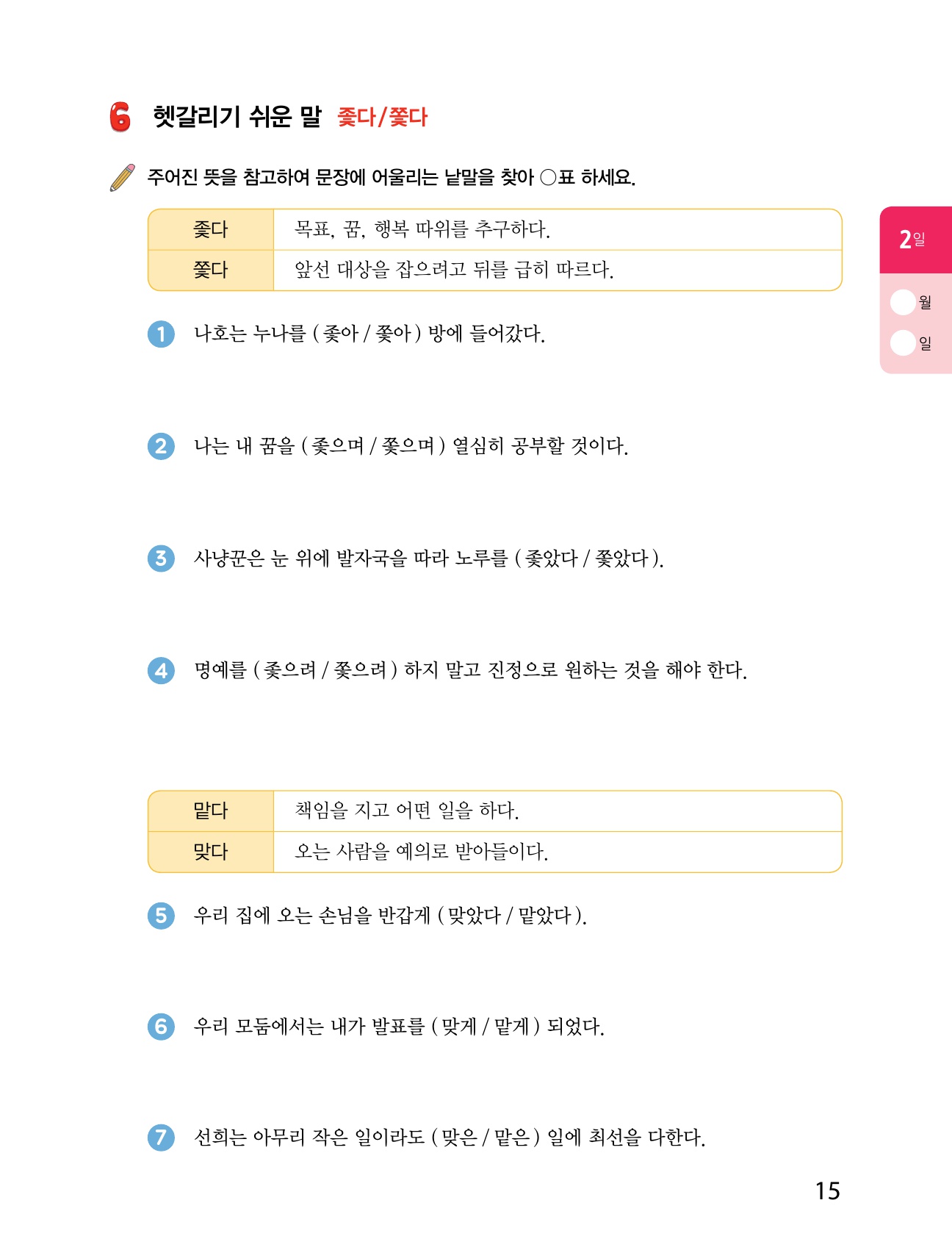앞에서 공부한 어휘들을 다시 한번 확인해 보면서 확실한 어휘 학습이 되었는지 점검해 보세요.