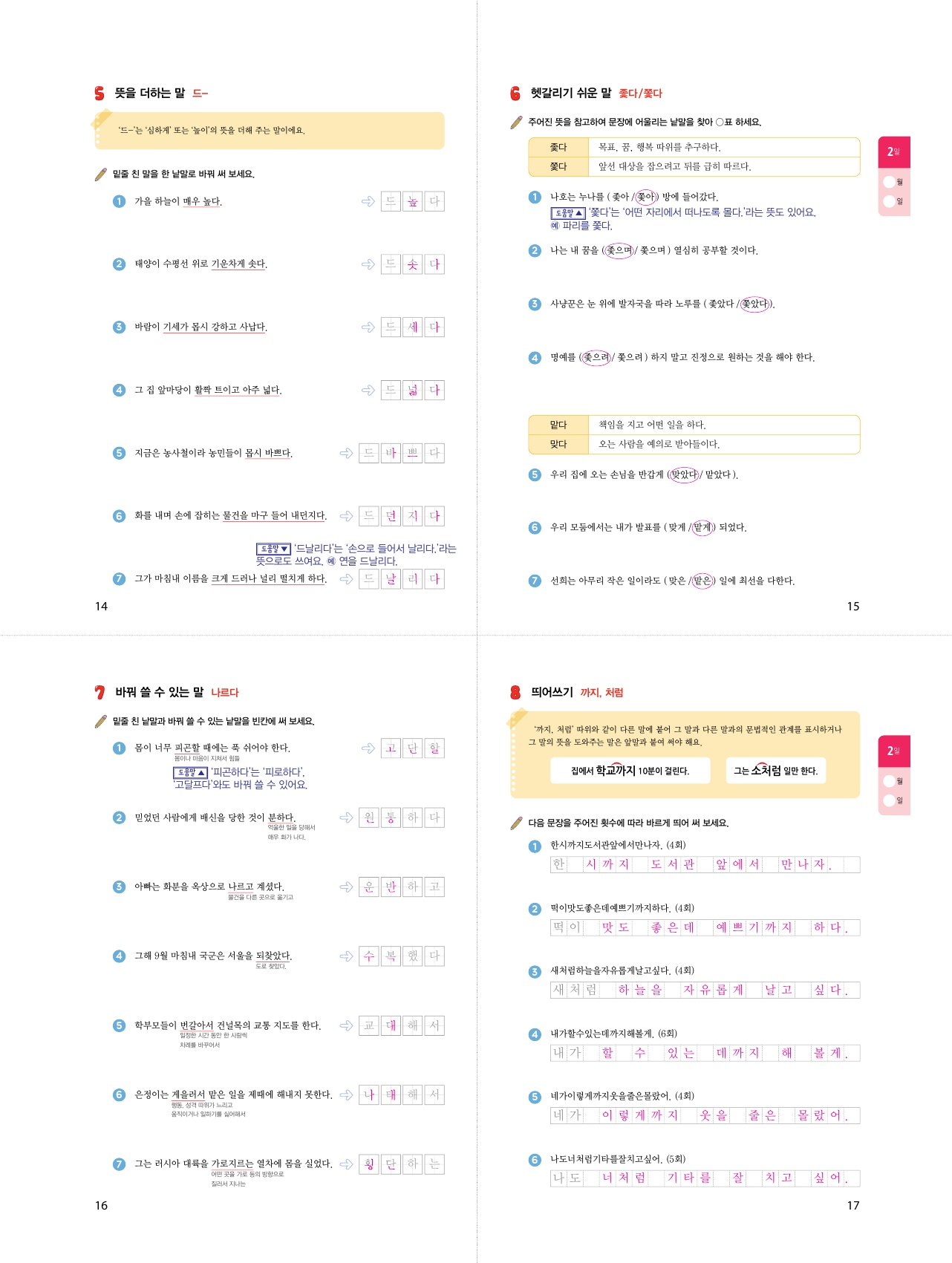 <잘못 쓰기 쉬운 말>, <헷갈리기 쉬운 말>, <문장 부호> 등의 맞춤법과 관련된 올바른 표현을 익혀 보세요.