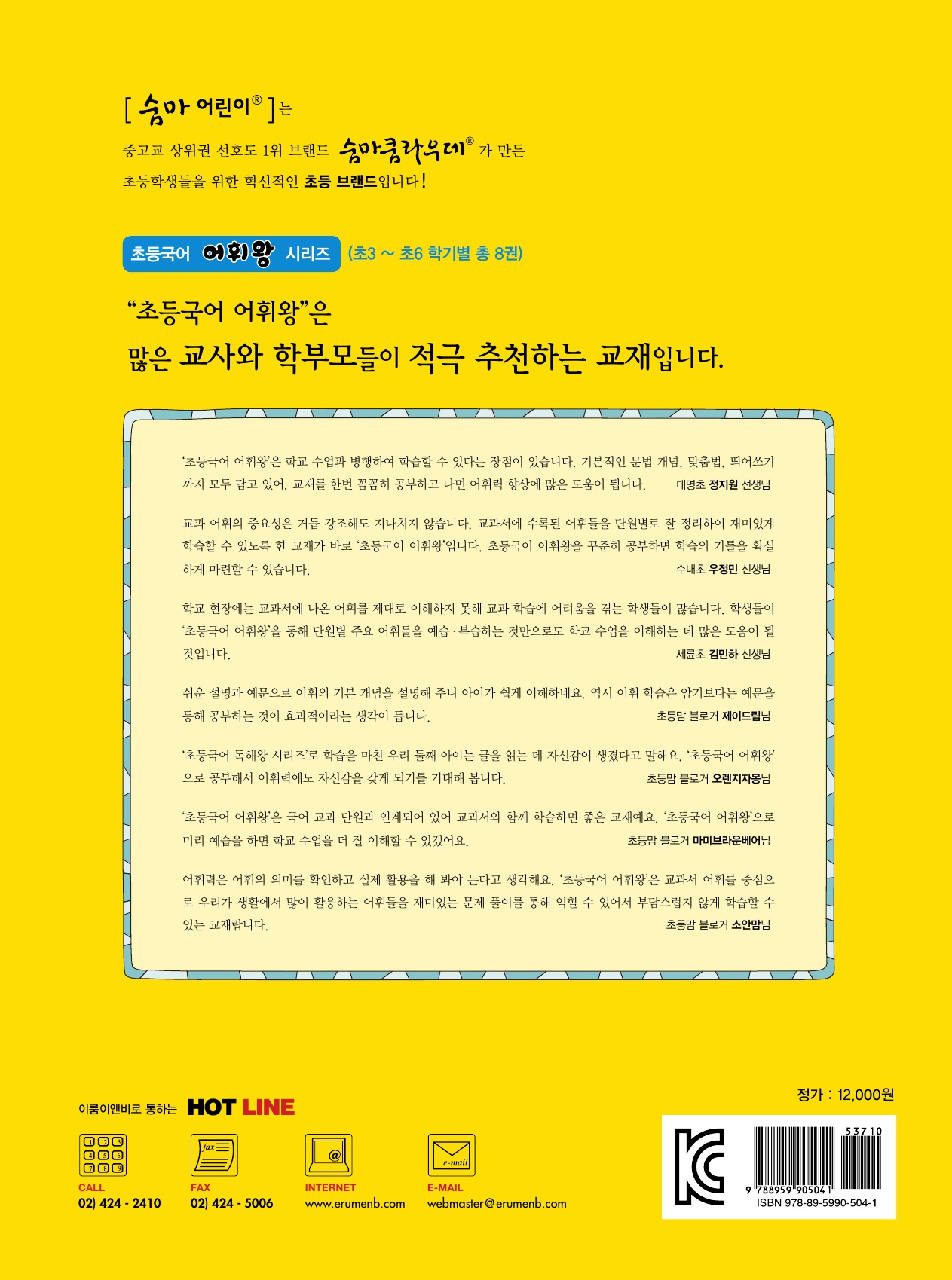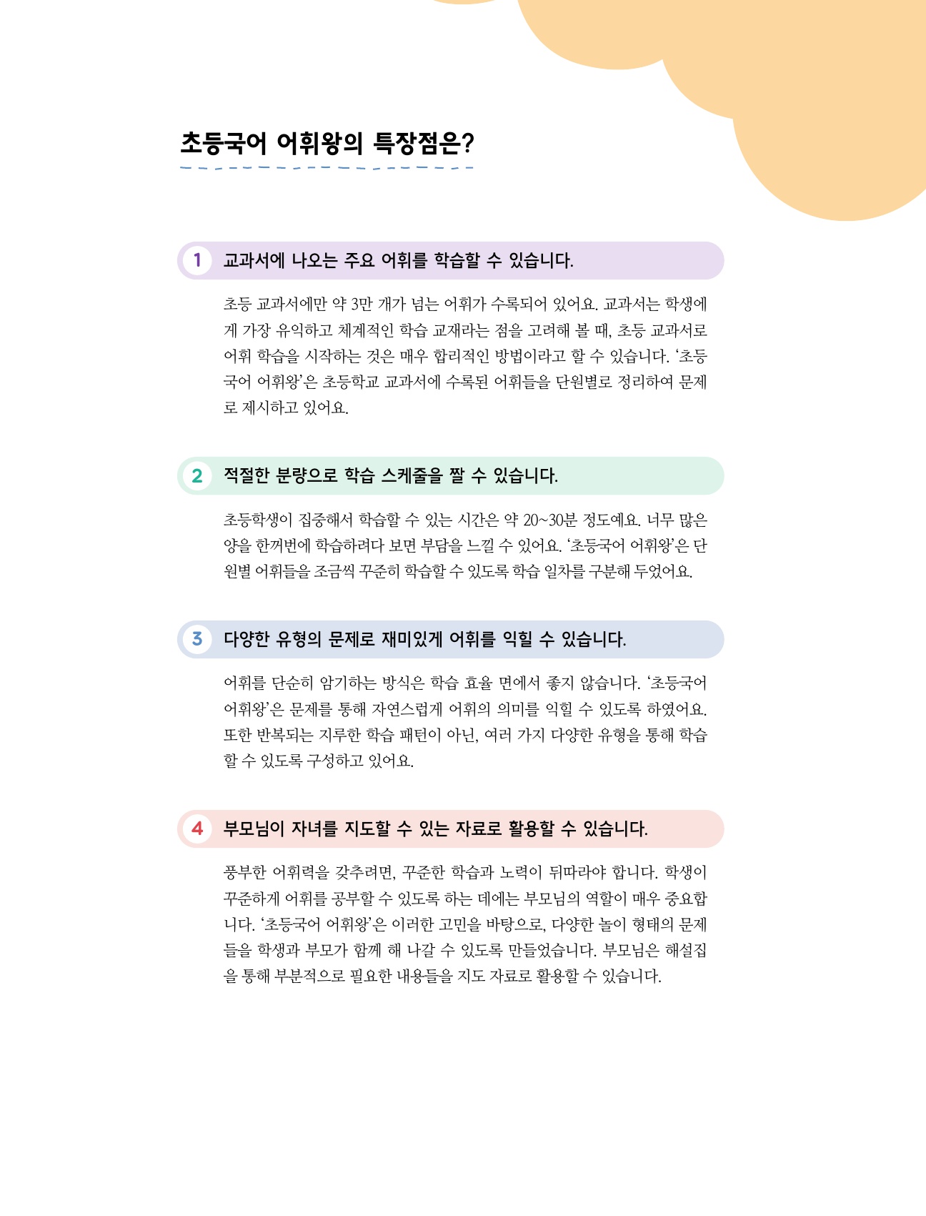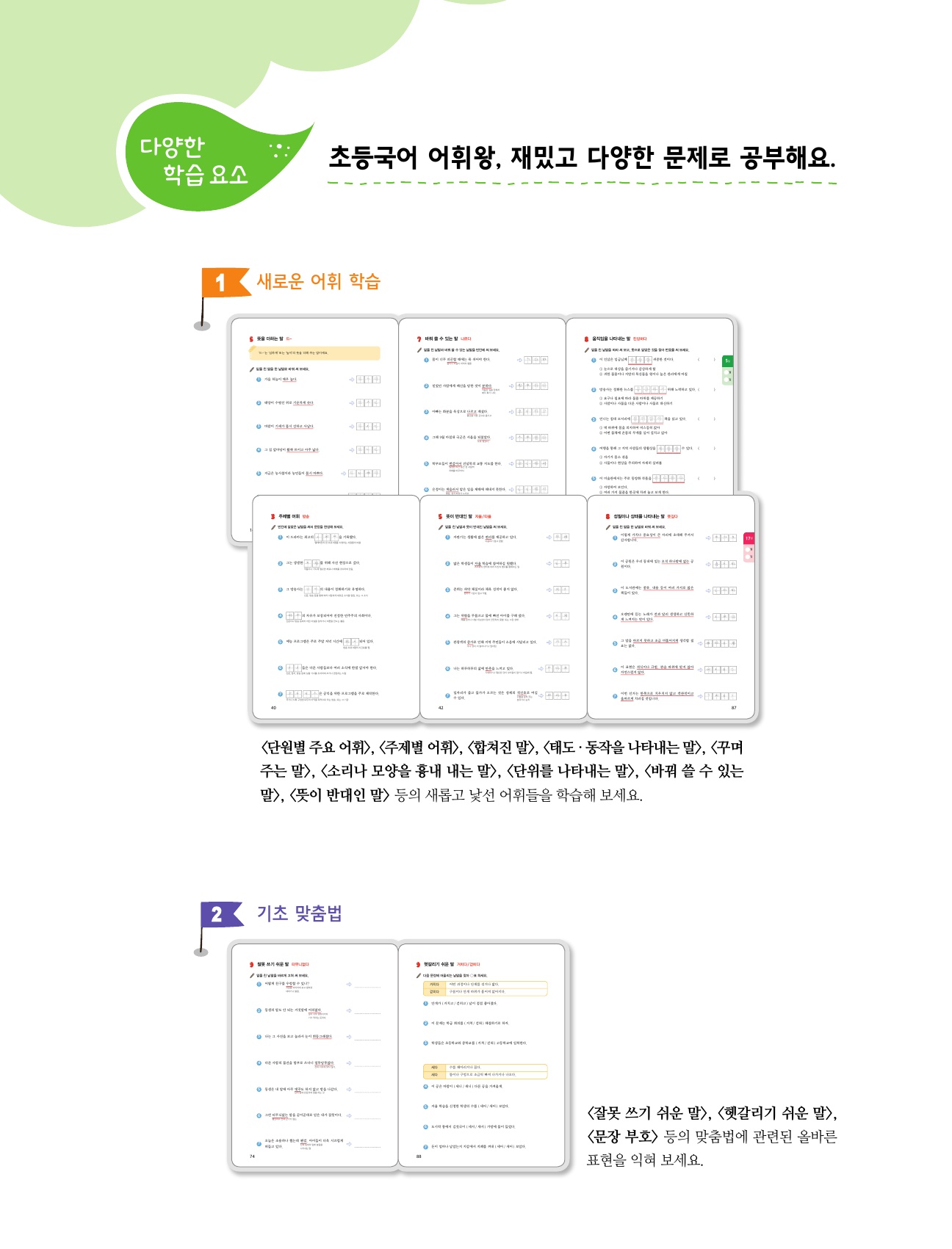 | 초등 시기의 어휘 학습은 국어 교육에서 가장 중요한 부분이라고 할 수 있는데요초등학업 능력의 바탕이 되기도 하고 중등 고등 공부에 도움이 돼요.기본적인 문법은 물론 개념, 맞춤법, 띄어쓰기와 국어 교과서외 타교과 어휘 관용어, 속담 까지 두루 문제 유형으로 제시 되어 있어 어휘를 배우는 시기에지루하고 어렵지 않게 어휘를 익힐 수 있어요 | |||