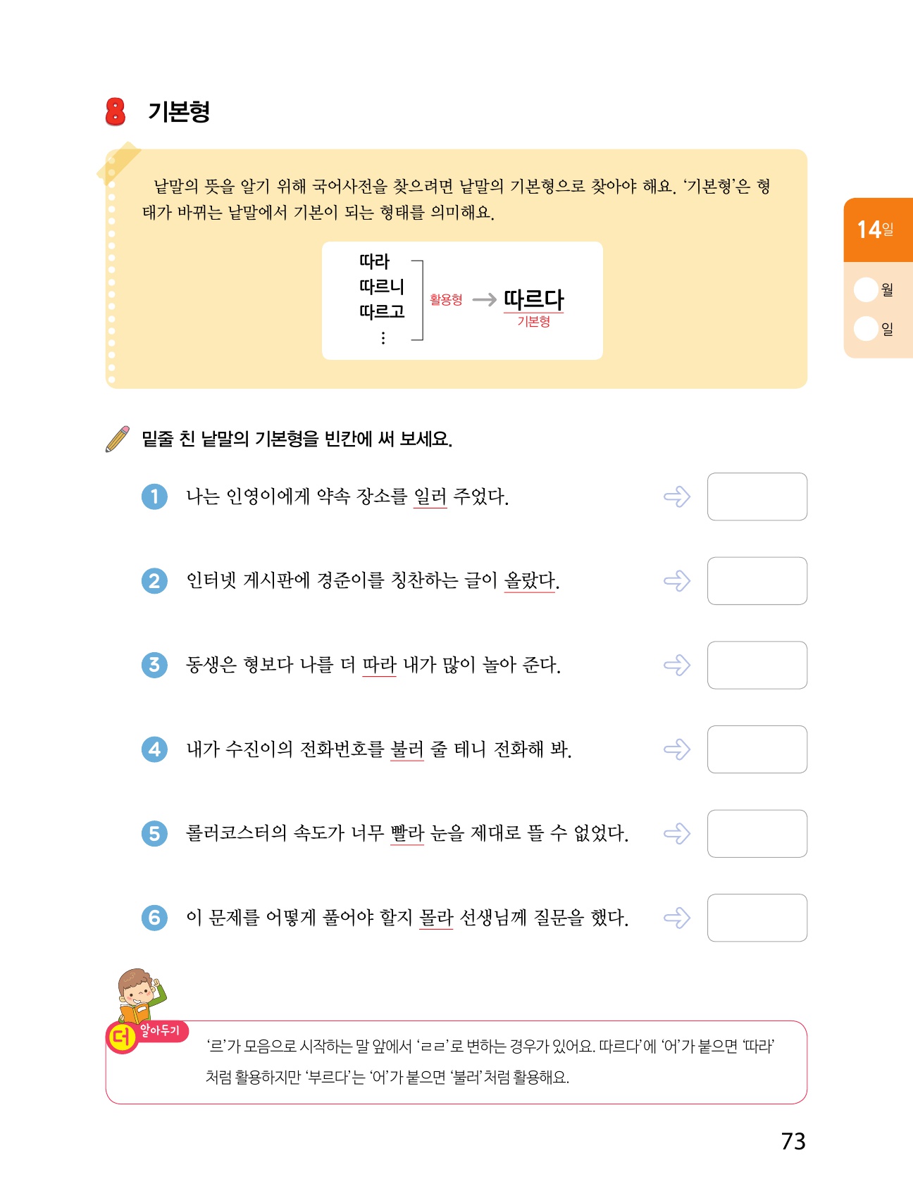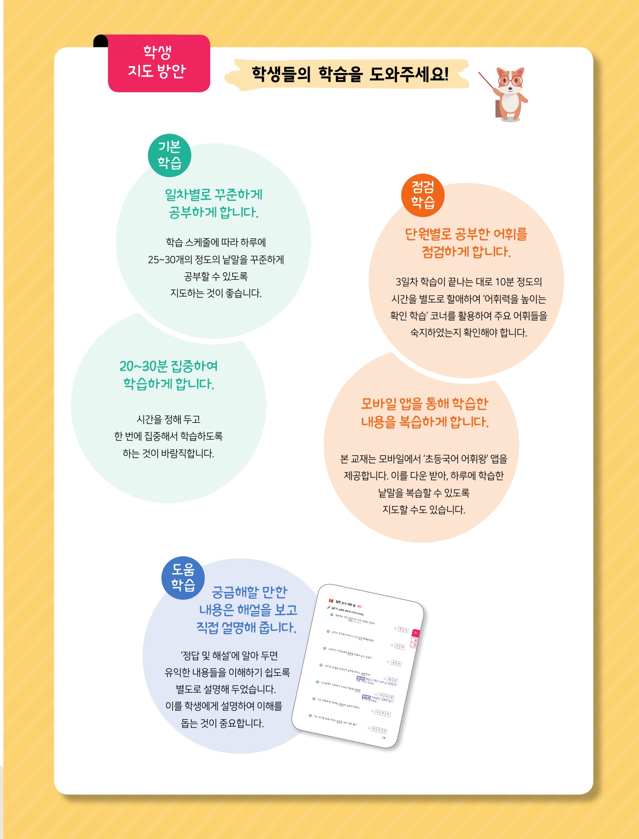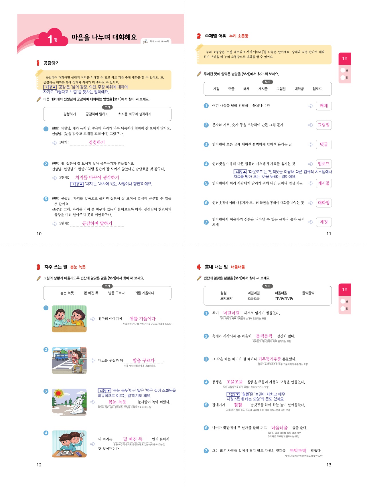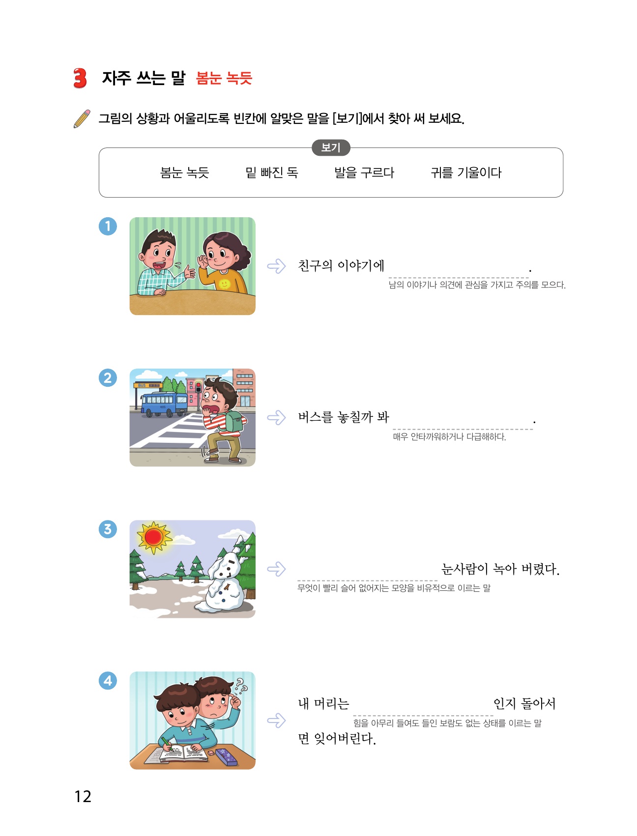 | 초등 시기의 어휘 학습은 국어 교육에서 가장 중요한 부분이라고 할 수 있는데요초등학업 능력의 바탕이 되기도 하고 중등 고등 공부에 도움이 돼요.기본적인 문법은 물론 개념, 맞춤법, 띄어쓰기와 국어 교과서외 타교과 어휘 관용어, 속담 까지 두루 문제 유형으로 제시 되어 있어 어휘를 배우는 시기에지루하고 어렵지 않게 어휘를 익힐 수 있어요 | |||
