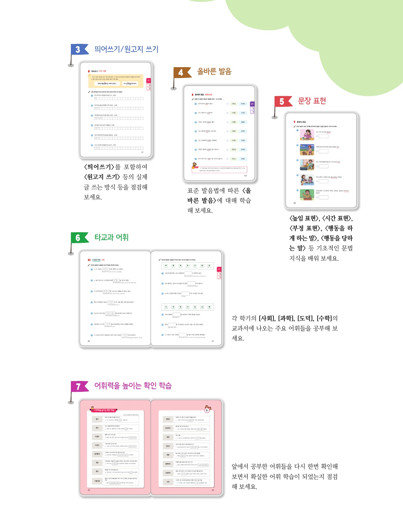<단원별 주요 어휘>, <주제별 어휘>, <합쳐진 말>, <태도·동작을 나타내는 말>, <꾸며 주는 말>, <소리나 모양을 흉내 내는 말>, <단위를 나타내는 말>, <바꿔 쓸 수 있는 말>, <뜻이 반대인 말> 등의 새롭고 낯선 어휘들을 학습해 보세요.