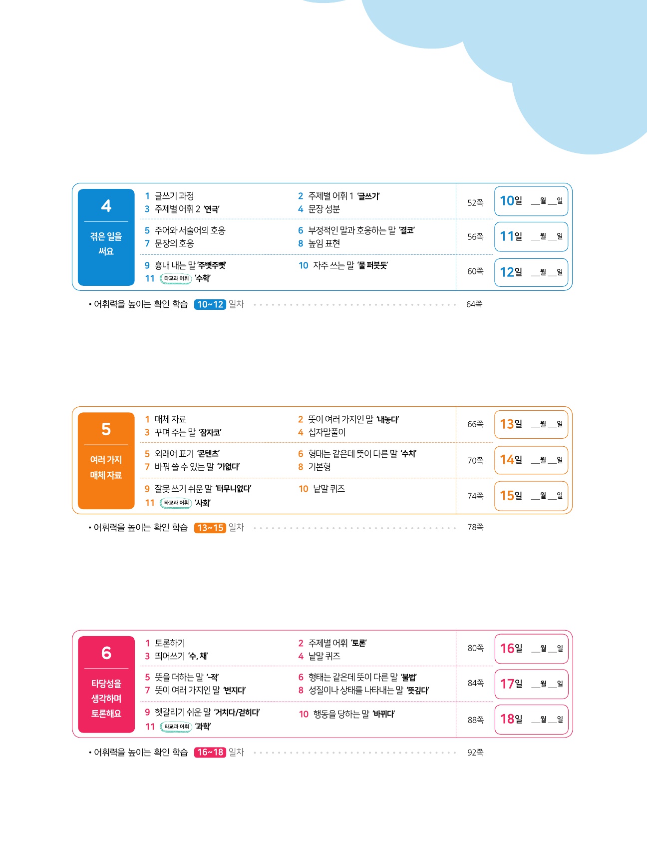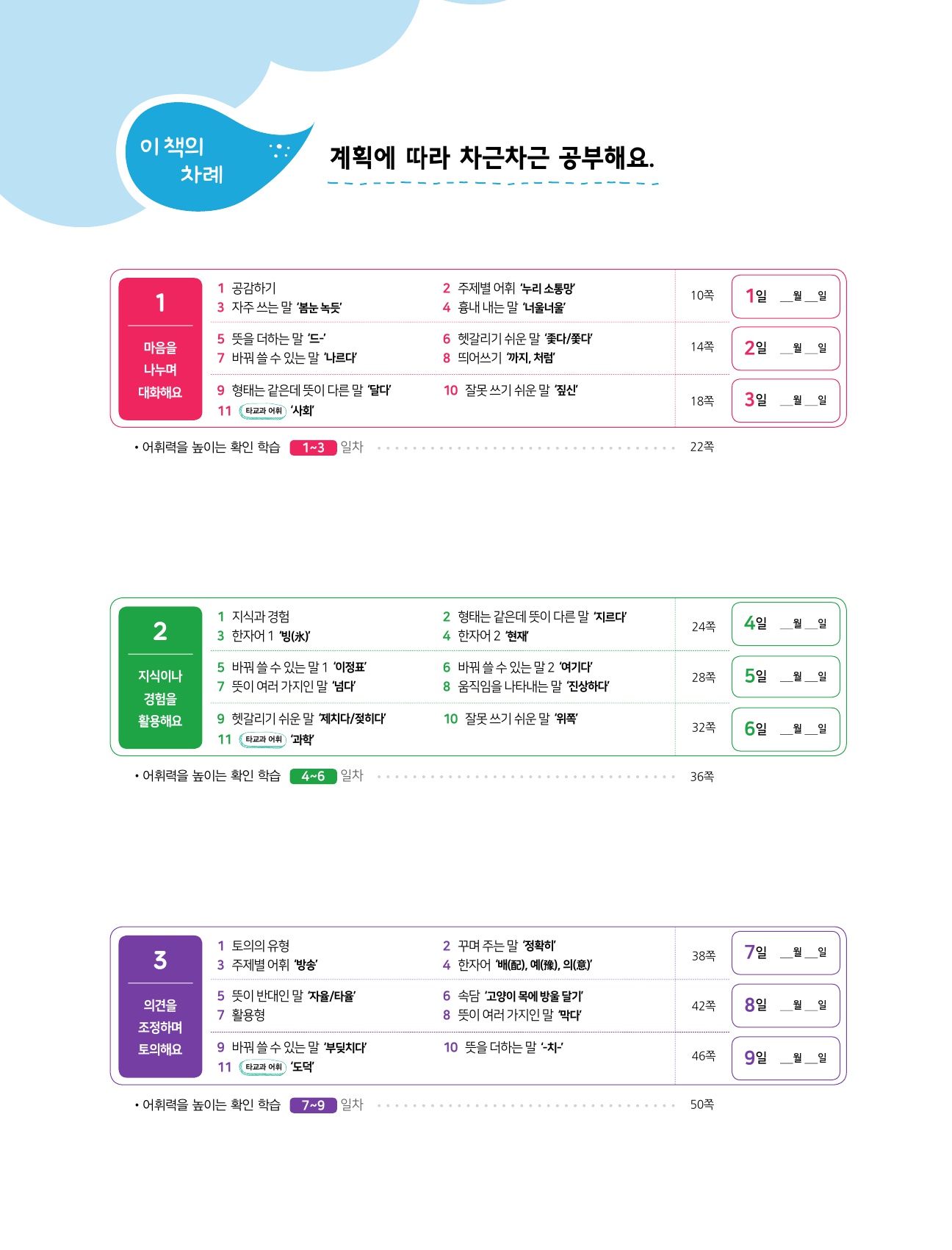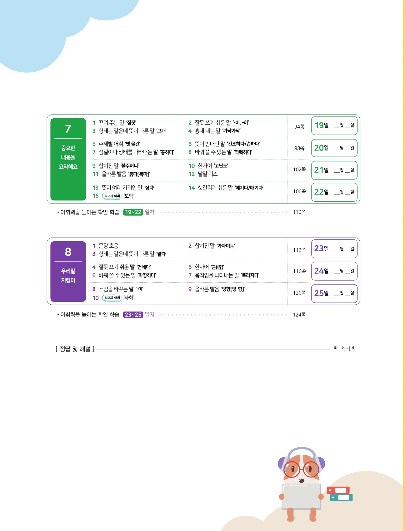 | 국어 뿐만 아니라 학교에서 배우는 다양한 교과의 단어를 접할 수 있어예습용 교재로도 너무 좋은 것 같네요.단원 주제별 주요 어휘를 다루기에한 번 더 배우고 써보면서 익히면 학교 수업에서무슨 말인지 바로바로 이해하게 되더라고요.어휘왕은 하루에 2장씩의 분량으로 학습하게 되는데요 초등학생이 집중해서 학습할 수 있는 시간은 약 20~30분이라니매일 조금씩 꾸준히 학습을 한다면놓치는 부분없이 최고의 집중력으로 학습할 수 있는 것 같아요. | |||