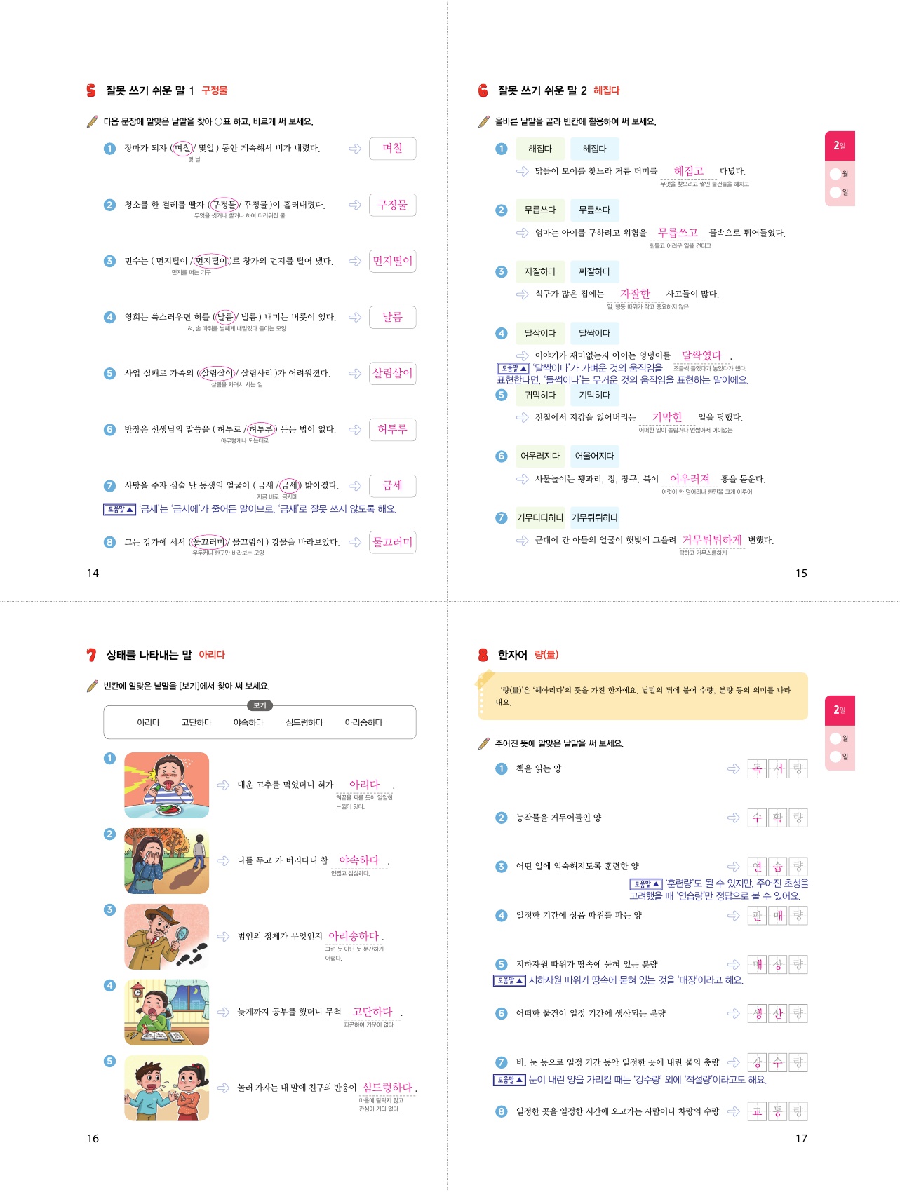 | 바꿔쓸 수 있는말, 모양을 흉내 내는 말, 생활과 관련된 관용어 등다양하게 준비되어 있는 학습 내용을 확인할 수 있는데요, 매 장별로 공부를 하면서는 더욱 많은 내용을 볼 수 있습니다.그만큼 획일적이지 않게 공부를 할 수 있어서 좋은 교재네요 | |||