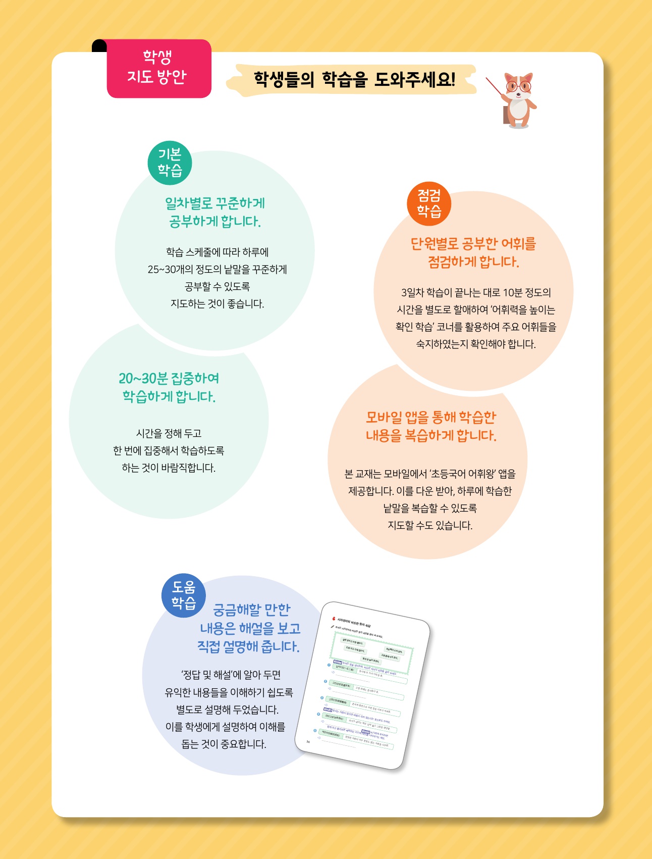 | 아이들이 초등국어어휘 학습을공부가 아닌 놀이로 인식하여 즐겁게 참여할 수 있고이를 통해 어휘력도 향상되는 이점이 있어요.지루한 학습이 아닌 놀이식으로매일 꾸준히 2장씩 학습하다보면자연스럽게 초등국어어휘를 익힐 수 있게 되어아이는 물론 저 역시 만족도가 높은 교재였어요. | |||