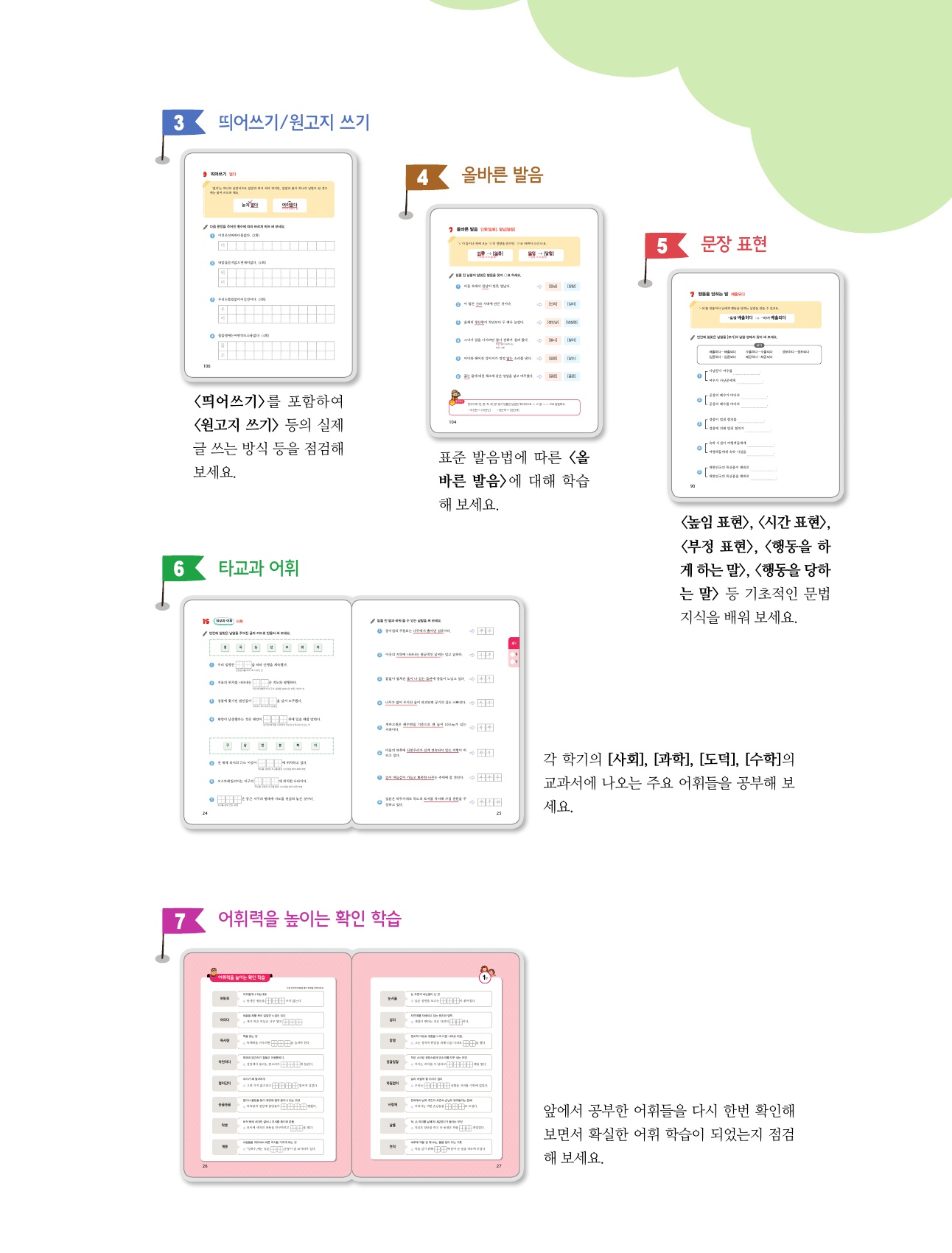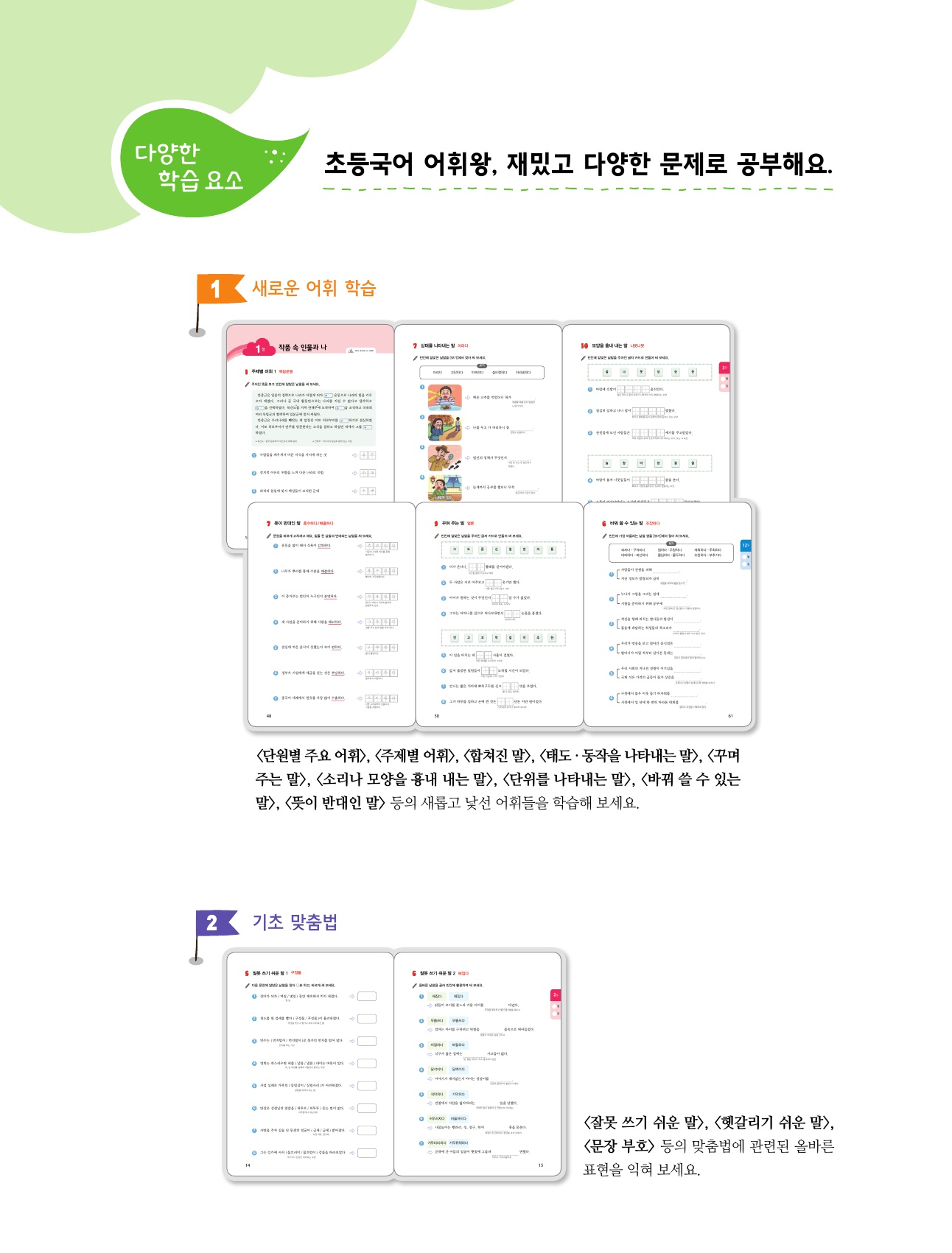 <단원별 주요 어휘>, <주제별 어휘>, <합쳐진 말>, <태도·동작을 나타내는 말>, <꾸며 주는 말>, <소리나 모양을 흉내 내는 말>, <단위를 나타내는 말>, <바꿔 쓸 수 있는 말>, <뜻이 반대인 말> 등의 새롭고 낯선 어휘들을 학습해 보세요.