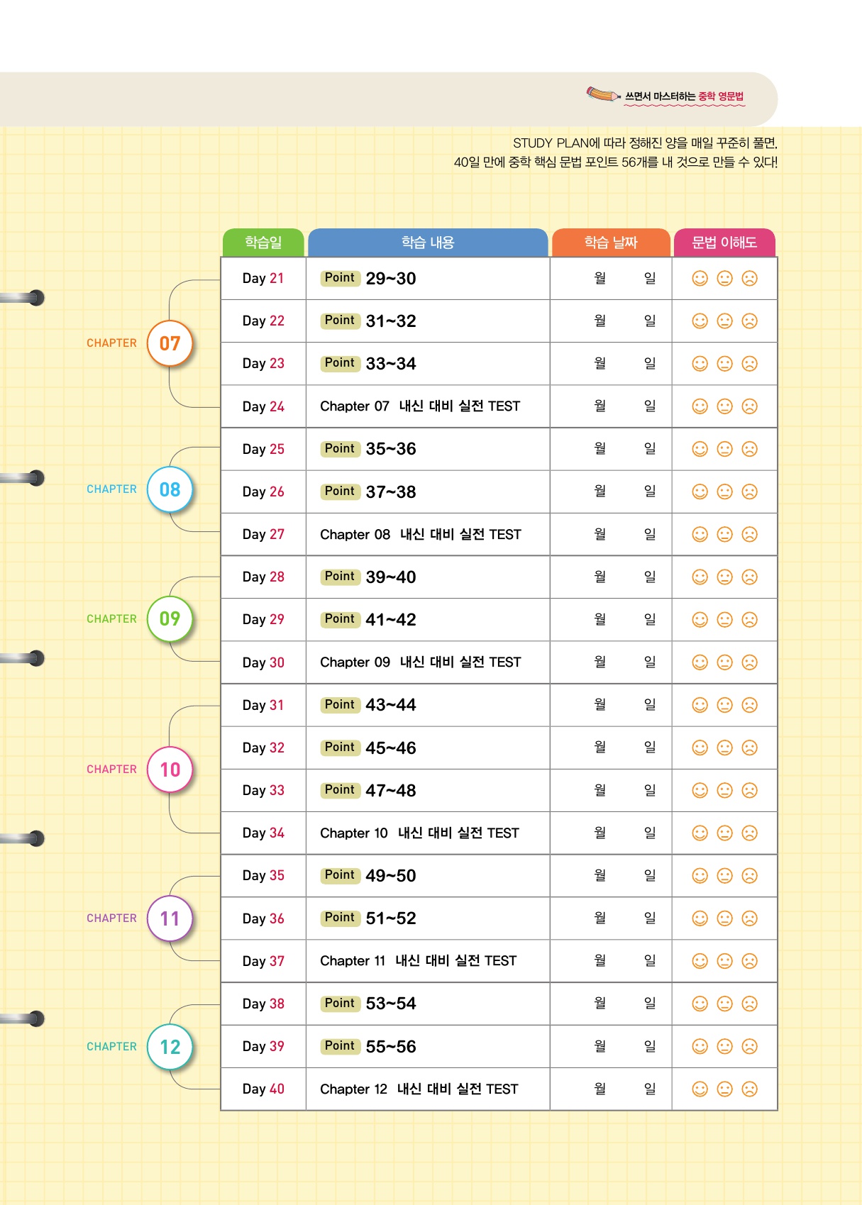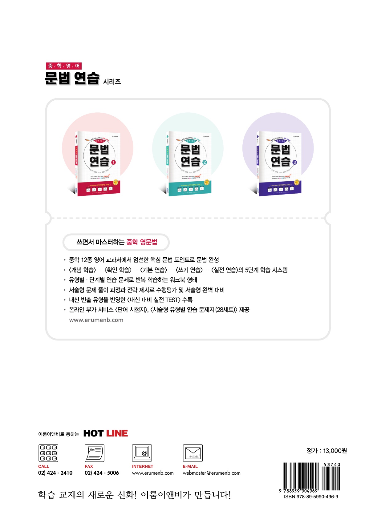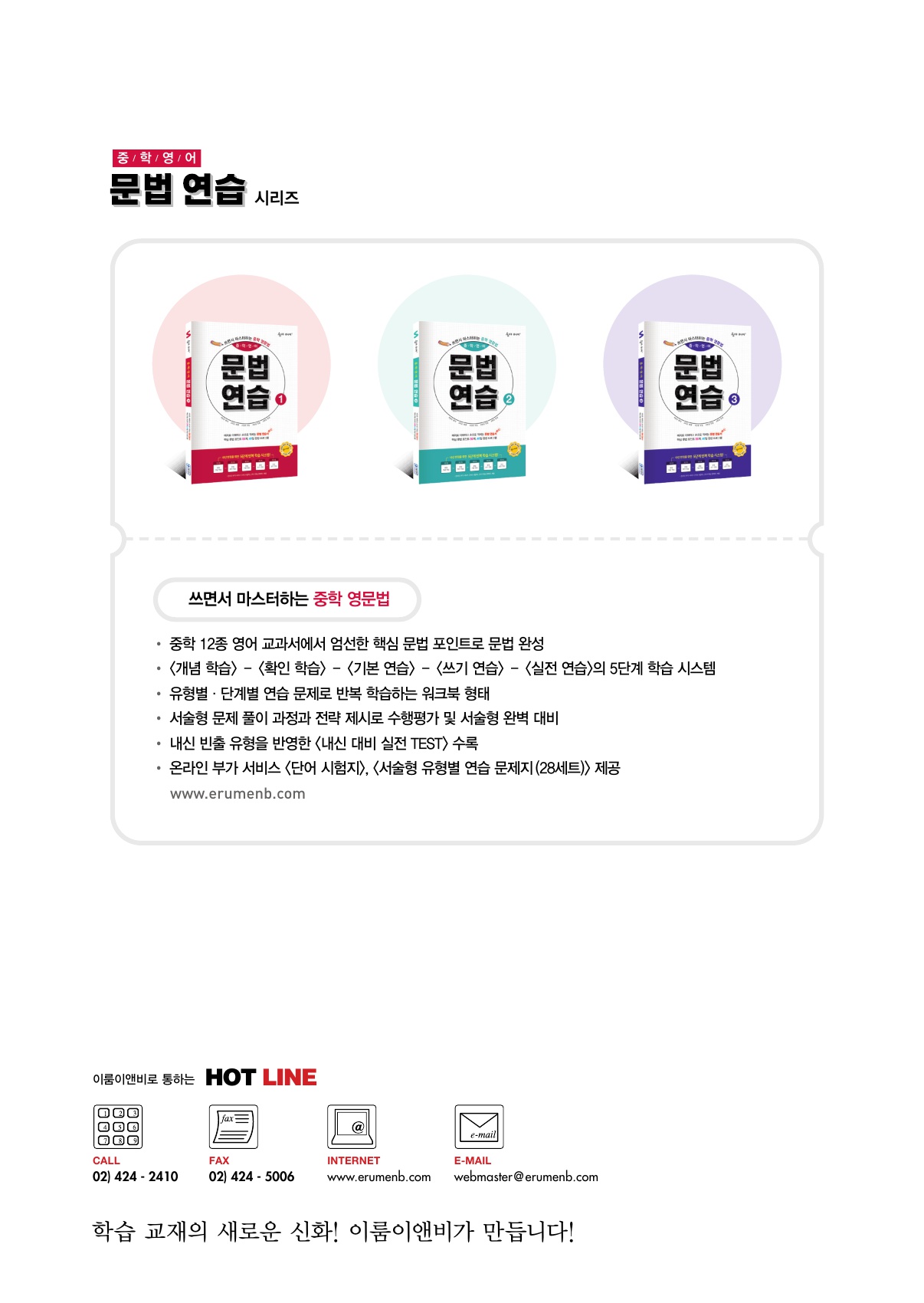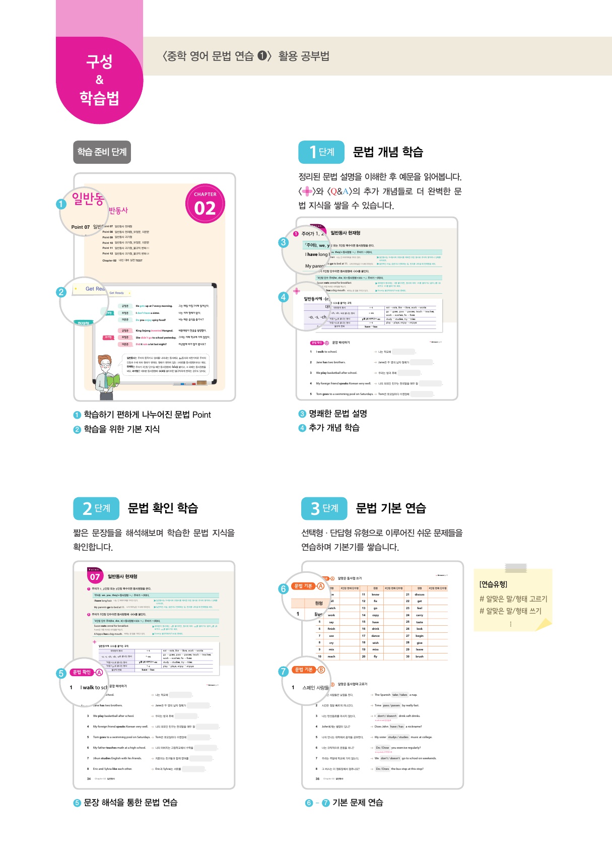| 예비중1되는 학생부터 중1에 이르기까지중등영문법을 정리하고 싶은 친구들에게 적합한 중등영어 문법교재입니다.요즘은 서술형이 영어에서도 필수라직접 쓰고 읽으며 학습하다보면, 정리가 술술 되는 교재예요! | |||