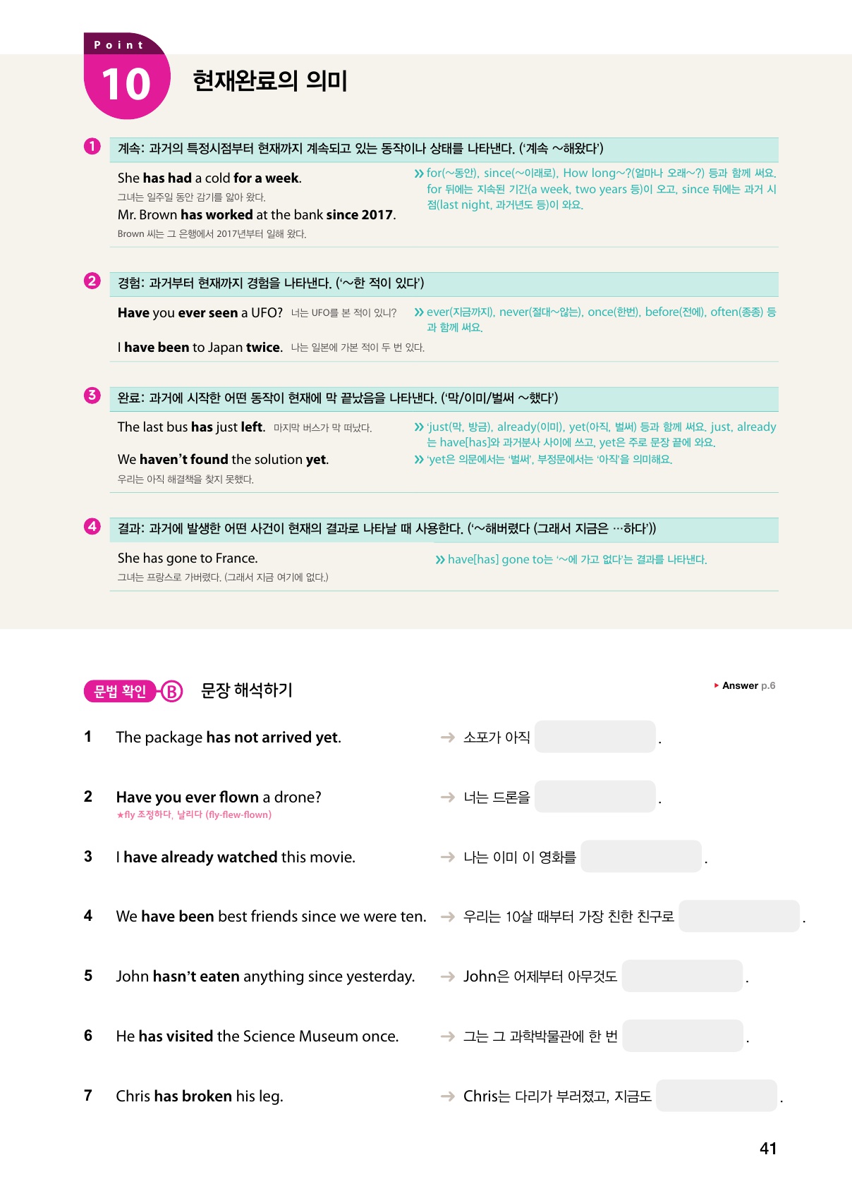 짧은 문장들을 해석해보며 학습한 문법 지식을 확인합니다.
