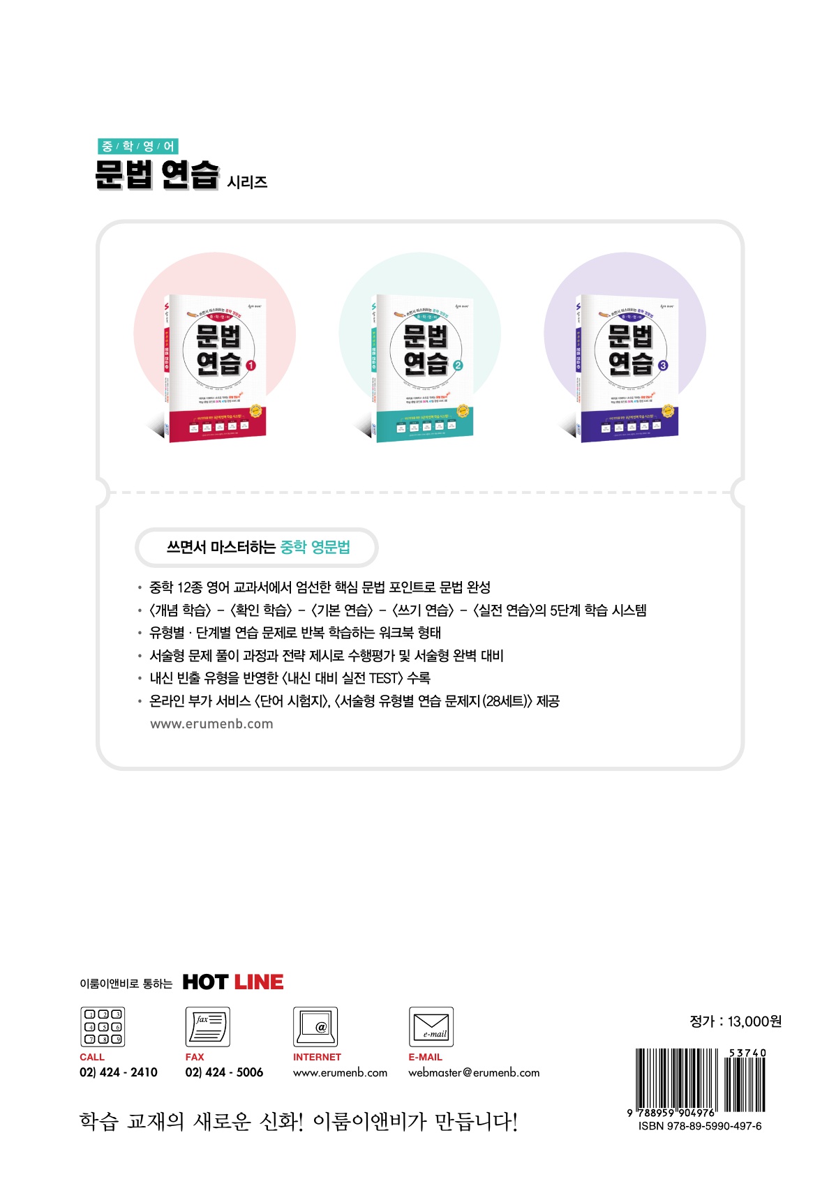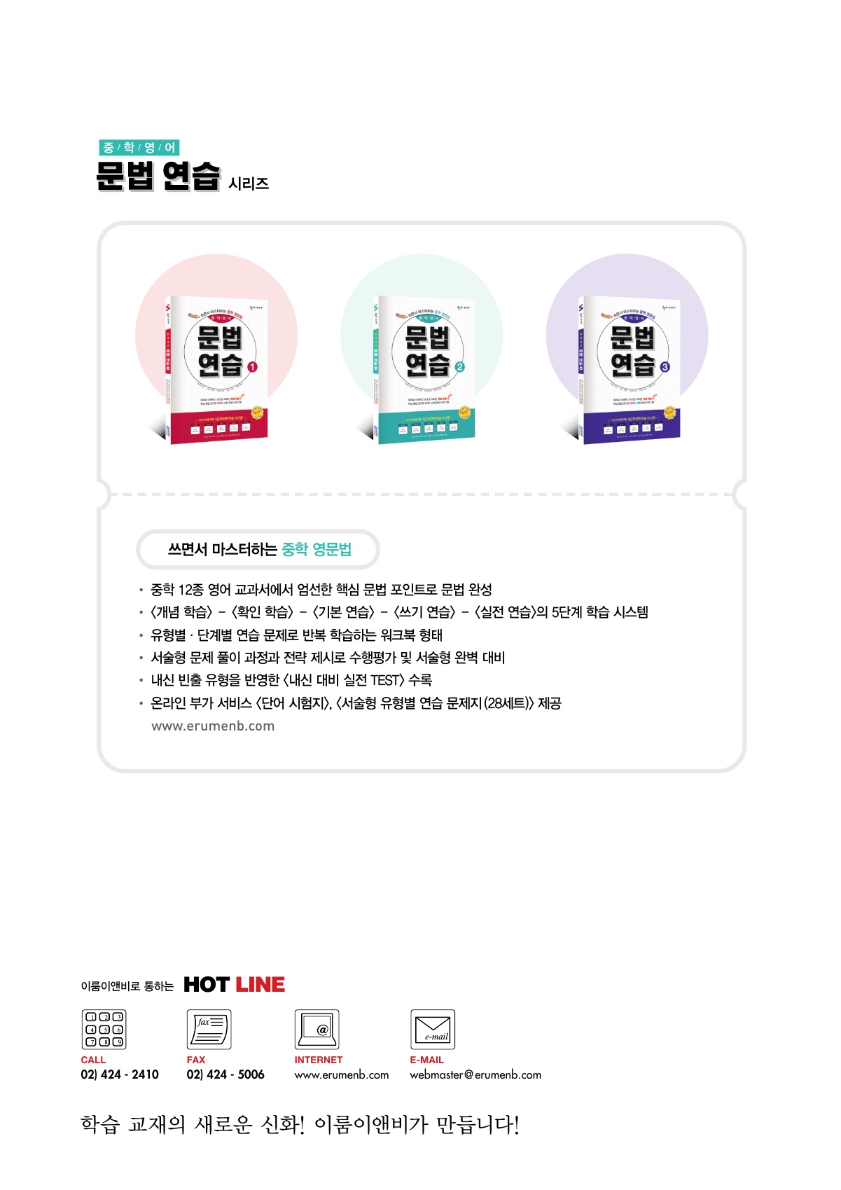 | 문법연습이란 이름답게 머리로 익힌 내용을바로 손으로 쓰면서 연습하고, 내것으로 만드는 일련의 과정을한권으로 끝내는 중등영문법 교재랍니다.핵심내용 챗기고, 추가 중요내용은 설명이 잘 되어 있어서혼공하는 친구들도 어렵지 않게 영어문법 학습이 가능합니다. | |||