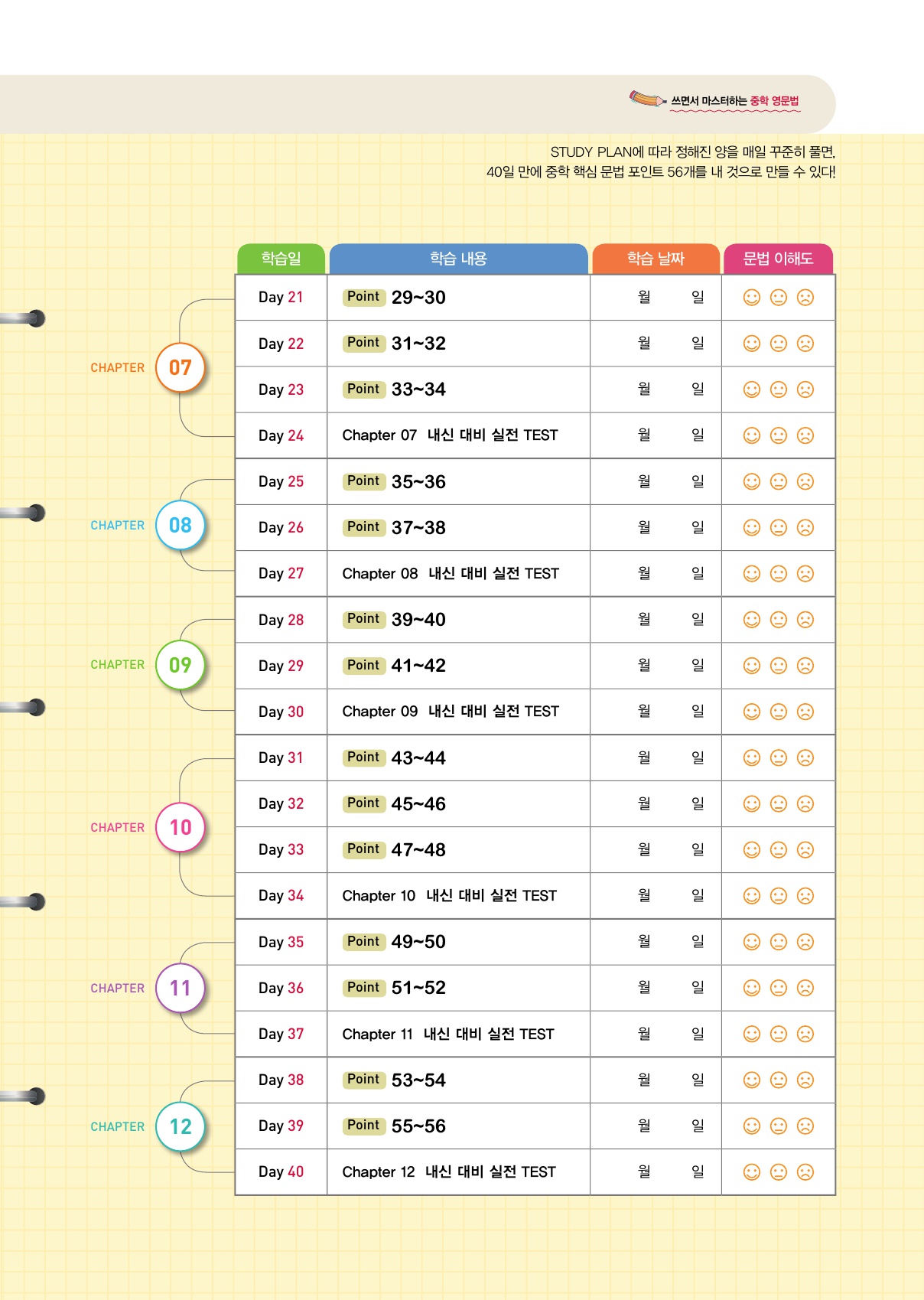 | 문법 개념을 쓰고 해석하고 어순을 배열하며 체득하게 되는 중2 영어 문법 교재! 5단계 반복 학습시스템 덕분에 영어문법 차곡차곡 쌓아가기 좋은 교재입니다. | |||