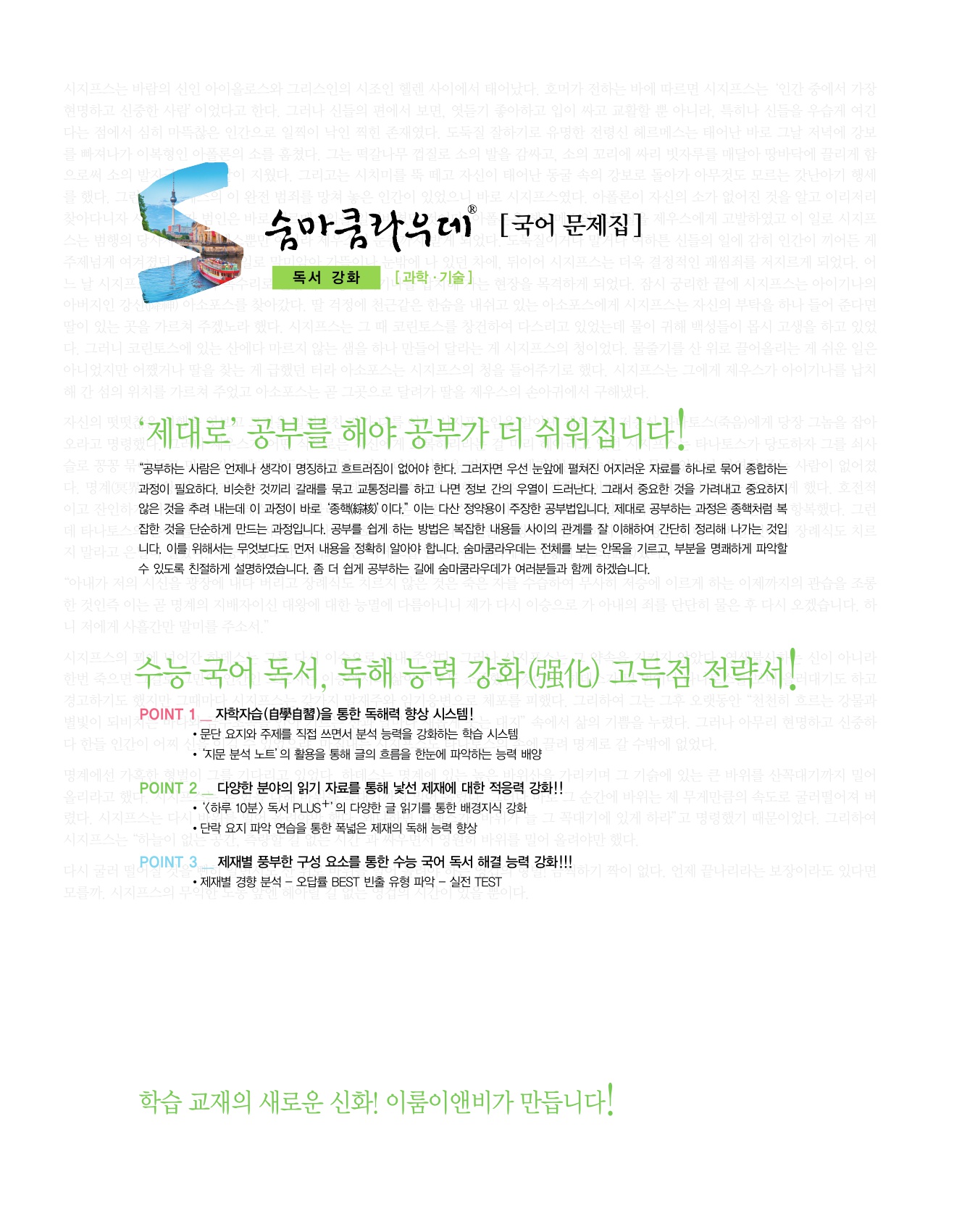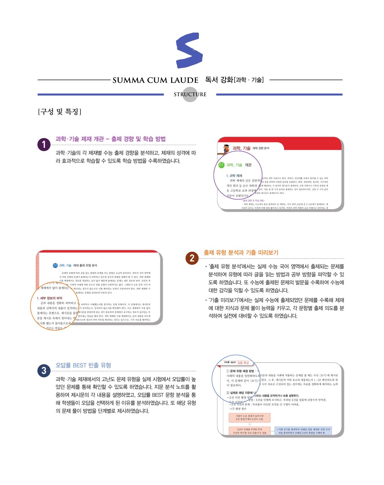 | 고등국어 독해 수능문제집 숨마쿰라우데 국어 독서강화(과학.기술) 은 고등학생들이 어려워하는 수능국어 과학기술제제의 지문을 집중해서 공부할 수 있는 차별화된 교재입니다.과학과 기술제제는 수능에서 항상 출제된 제제로 국어 영역 45문제중 과학제제 3~5문제, 기술제제 3~5문제가 출제되는데요~ 고등학생들에게 과학제제와 기술제제의 글은 어렵다고 생각하는 경우가 많아요. 과학적 지식이 담긴 글을 얼마나 깊이 이해했는지를 묻는 문제들로 깊이있는 학습이 선행되어야 지문을 잘 읽어나가고 고득점을 할 수 있기에 집중적으로 미리 공부를 해 둘 필요가 있는 부분입니다. 고등국어 독해의 어려워하는 부분인 과학, 기술 지문을 어떻게 읽어야하는지, 제시문을 어떻게 접근해야되는지 방향성을 제시해주는 교재가 바로 숨마쿰라우데 국어 독서강화(과학.기술) 입니다. | |||