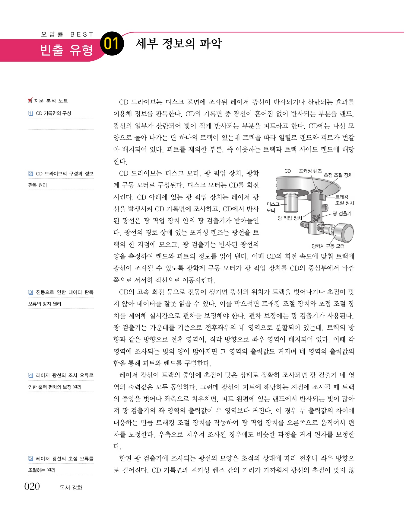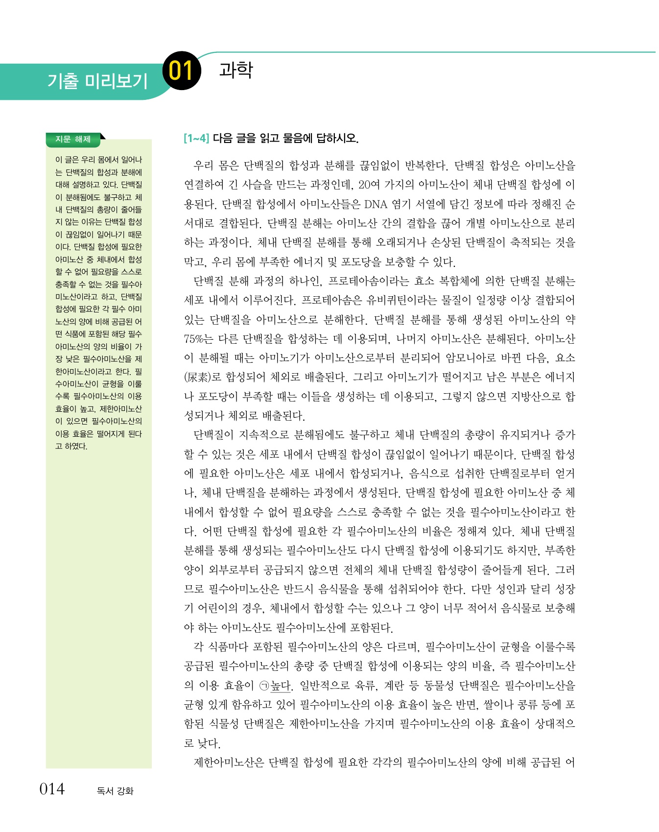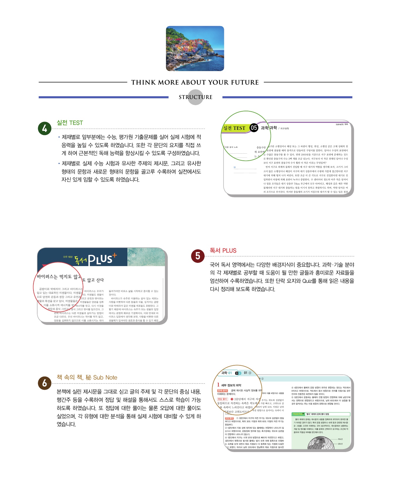 • 제재별로 앞부분에는 수능, 평가원 기출문제를 실어 실제 시험에 적응력을 높일 수 있도록 하였습니다. 또한 각 문단의 요지를 직접 쓰게 하여 근본적인 독해 능력을 향상시킬 수 있도록 구성하였습니다.