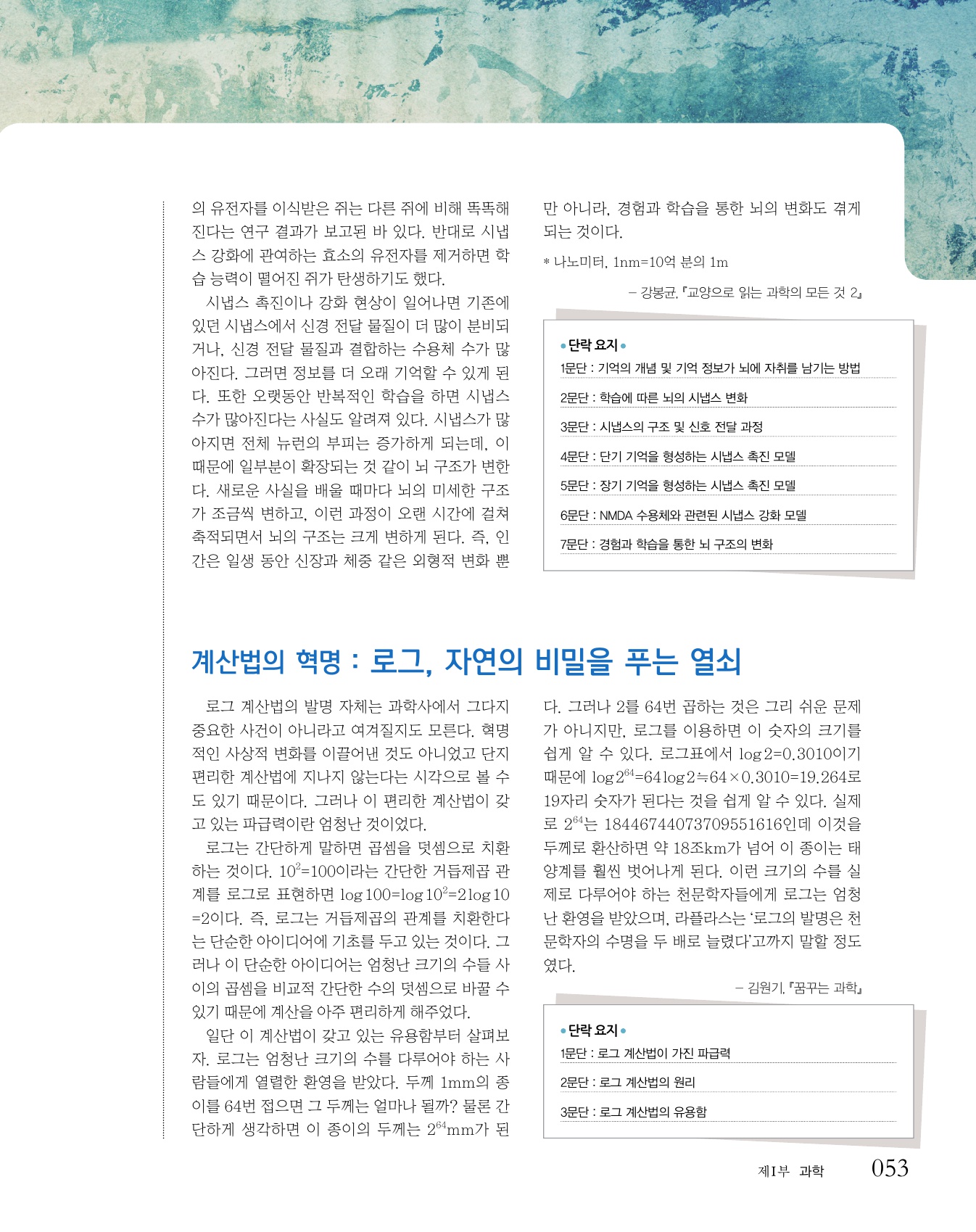 | 숨마쿰라우데 교재에서는 과학기술 지문의 경향을 분석하고오답률 BEST의 빈출유형을 01~05로 분류해주니고등독해 공부하는 학생들은 꼭 체크해봤으면 좋겠어요. 또한 국어 독서 영역에서는 다양한 배경지식이 중요한데요. 과학,기술 분야의 각 제재별로 공부할 때 도움이 될 만한 글들과 흥미로운 자료들을 따로 수록하고 있어 아이들에게 이런 부분도 정말 많은 도움이 되겠어요.우리아이는 로그 계산과 관련한 지문을 흥미롭게 읽더라구요. | |||