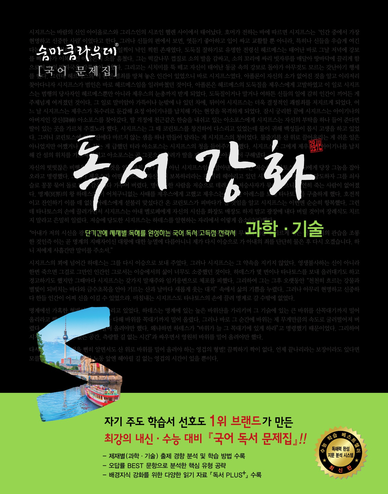 | 숨마쿰라우데 독서 강화 과학 기술은 과학제재와 기술제재의 출제 경향을 분석하여 어떻게 읽어내려가야하는지글을 읽는 방법과 문제를 푸는 방법들을 알려주고 있습니다.어렵게만 느껴졌던 과학기술 분야의 글을 단계별로 학습함으로써 독서해결능력이 뿜뿜!! 올라갈 거라 생각합니다 | |||