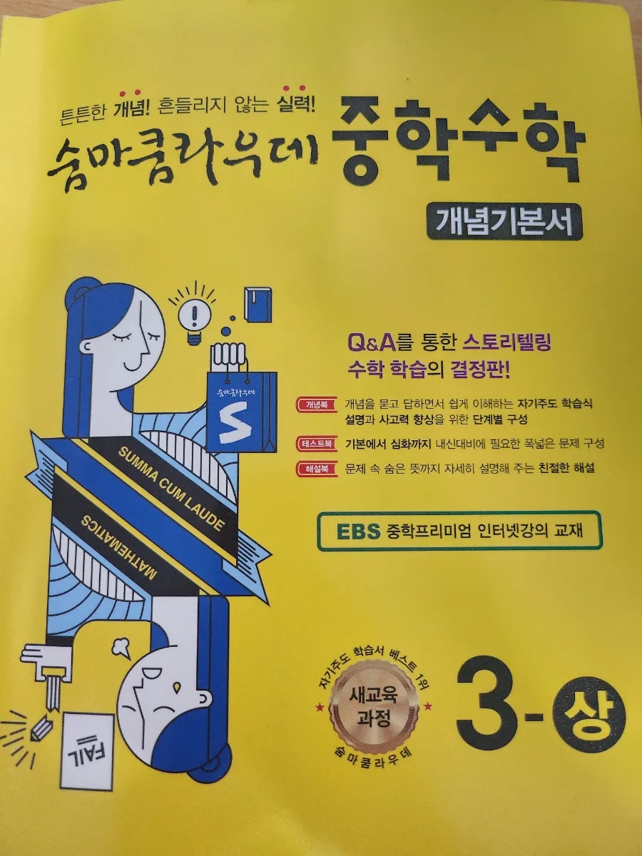 숨마쿰라우데 중학수학 3-상 혼자 공부하기 좋은 교재입니다. 해설이 자세하고 개념설명이 쉽고 재미있습니다. |